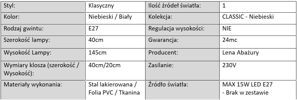 Lampa Podłogowa Stojąca Classic Niebieska / 1xE27