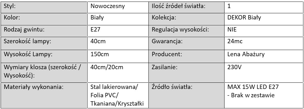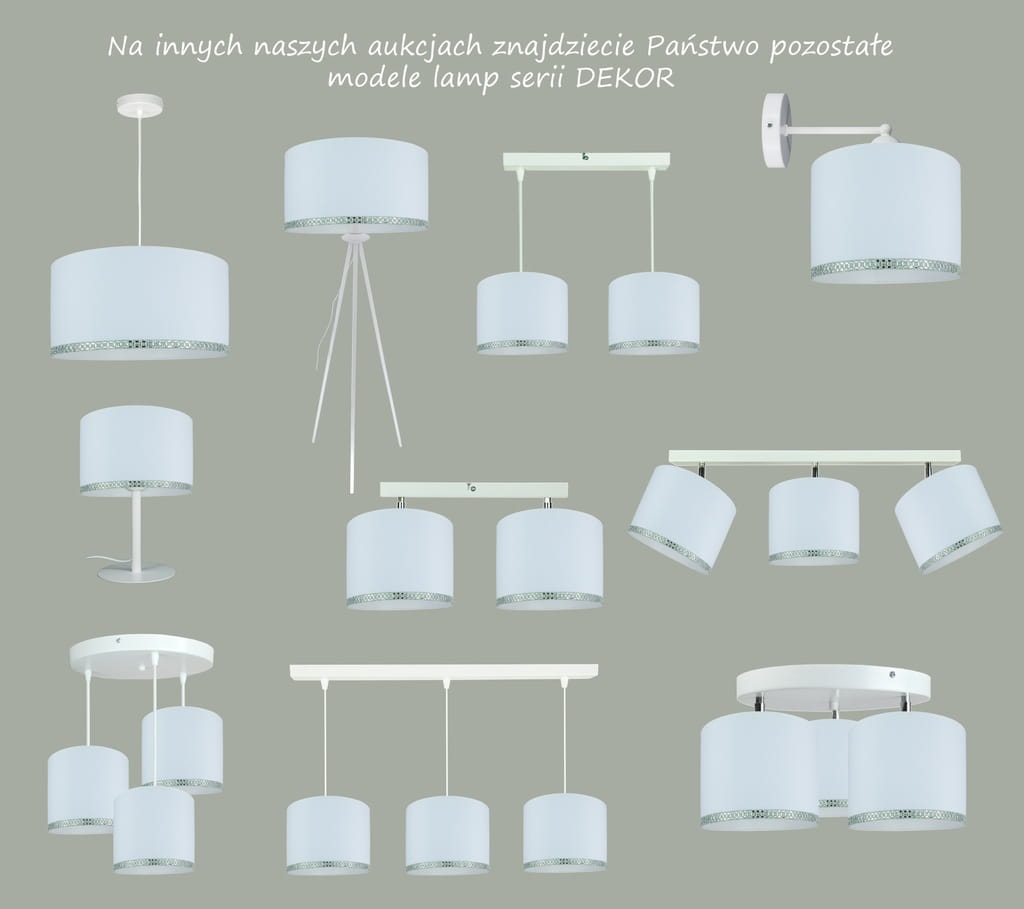 Lampy z kolekcji Dekor Biały to propozycja dla osób ceniących połączenie subtelnej elegancji, ponadczasowego stylu i funkcjonalności. Białe abażury ze stylowym wykończeniem w postaci ozdobnego pasa z kryształków nadają oprawom świetlnym luksusowy charakter, a biała folia wewnątrz klosza dodatkowo wzmacnia rozchodzenie się światła, tworząc we wnętrzu przyjemną i ciepłą atmosferę.