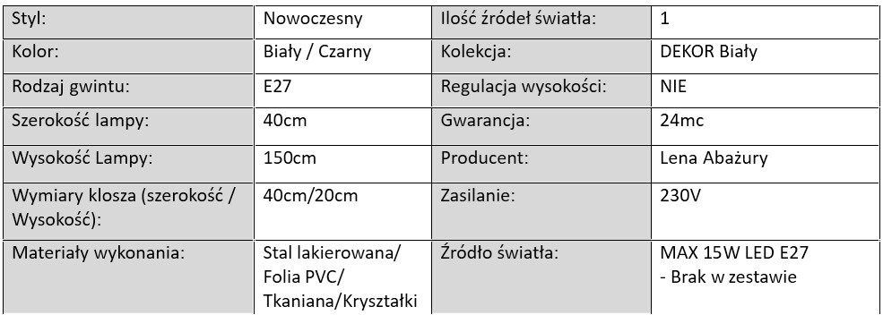 Lampy z kolekcji Dekor Biały to propozycja dla osób ceniących połączenie subtelnej elegancji, ponadczasowego stylu i funkcjonalności. Białe abażury ze stylowym wykończeniem w postaci ozdobnego pasa z kryształków nadają oprawom świetlnym luksusowy charakter, a biała folia wewnątrz klosza dodatkowo wzmacnia rozchodzenie się światła, tworząc we wnętrzu przyjemną i ciepłą atmosferę.