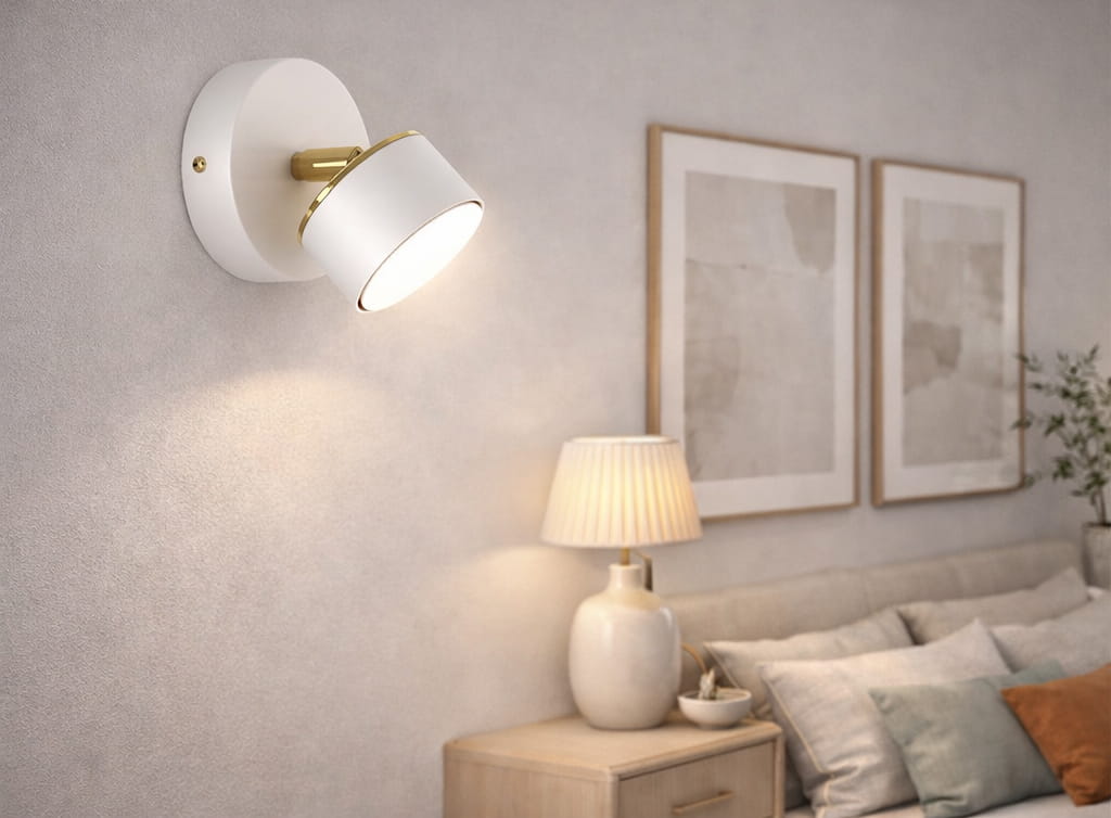 Połączenie białej obudowy ze złotymi detalami nadaje kinkietowi elegancki, ponadczasowy charakter, dzięki czemu doskonale sprawdzi się zarówno jako oświetlenie użytkowe, jak i dekoracyjny akcent ścienny.
