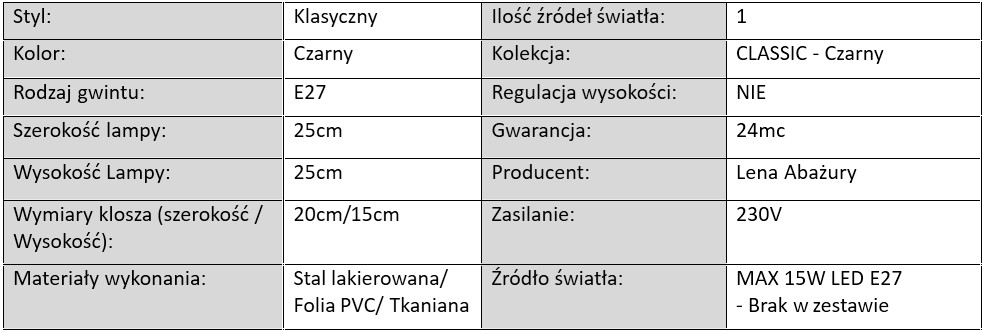 Lampy z serii CLASSIC – Czarny to nie tylko styl, ale także trwałość i funkcjonalność. Każdy model został zaprojektowany z dbałością o detal, co widać zarówno w wykończeniu abażurów, jak i w konstrukcji metalowych stelaży. Stelaże dostępne są w kolorze czarnym lub białym, wykonane z metalu malowanego proszkowo, dzięki czemu są odporne na zarysowania, uszkodzenia i działanie wilgoci.