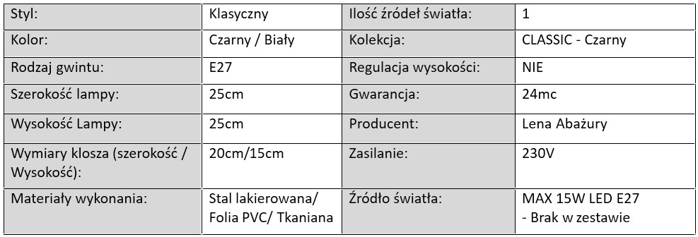 Lampy z serii CLASSIC – Czarny to nie tylko styl, ale także trwałość i funkcjonalność. Każdy model został zaprojektowany z dbałością o detal, co widać zarówno w wykończeniu abażurów, jak i w konstrukcji metalowych stelaży. Stelaże dostępne są w kolorze czarnym lub białym, wykonane z metalu malowanego proszkowo, dzięki czemu są odporne na zarysowania, uszkodzenia i działanie wilgoci.
