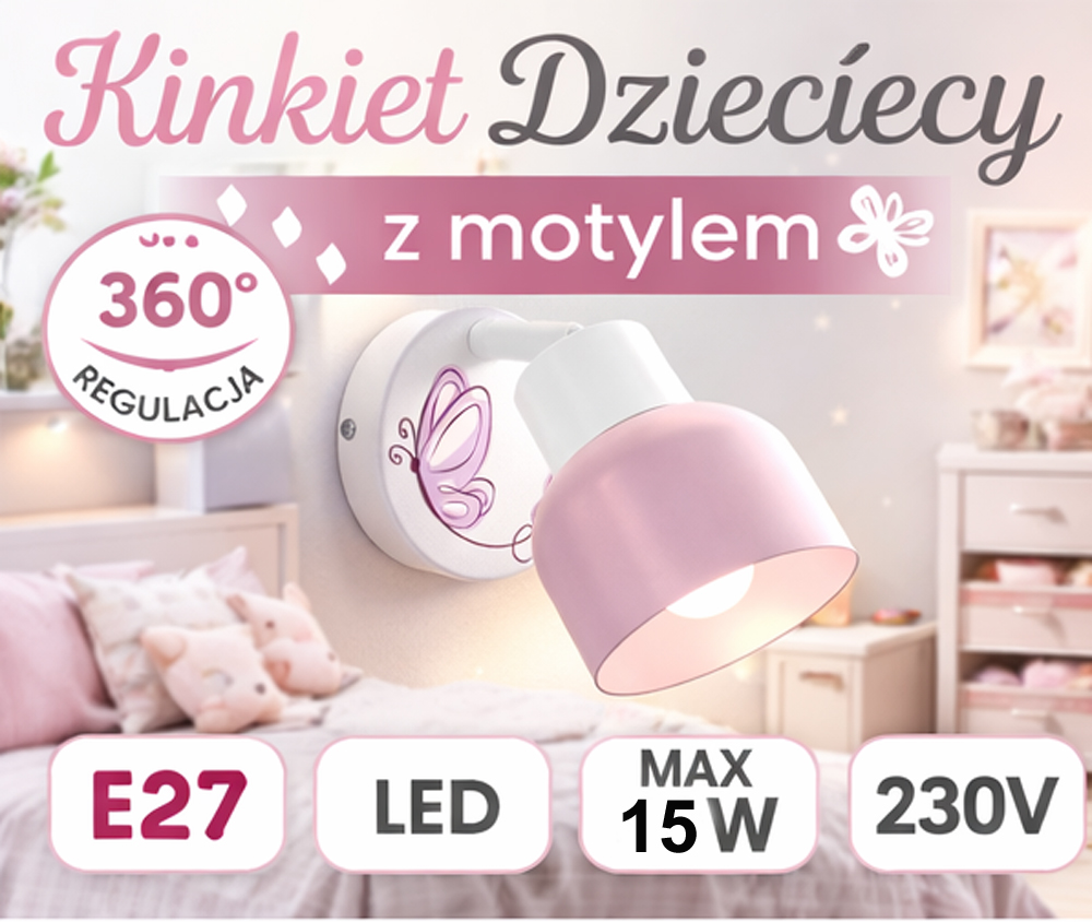 Jeśli szukasz kinkietu do pokoju dziewczynki z gwintem E27, który łączy funkcjonalność z delikatnym, romantycznym designem, model Motylki Różowe będzie doskonałym wyborem. Tworzy przyjazną, ciepłą atmosferę sprzyjającą wyciszeniu, czytaniu i codziennemu odpoczynkowi dziecka.