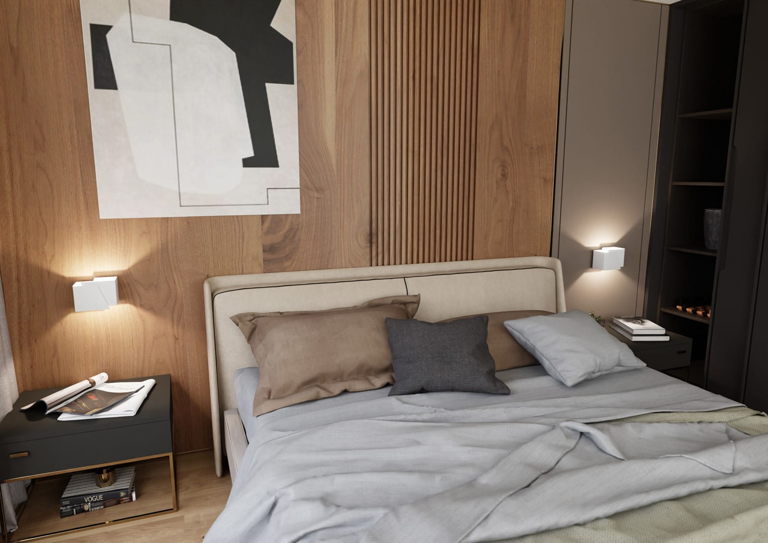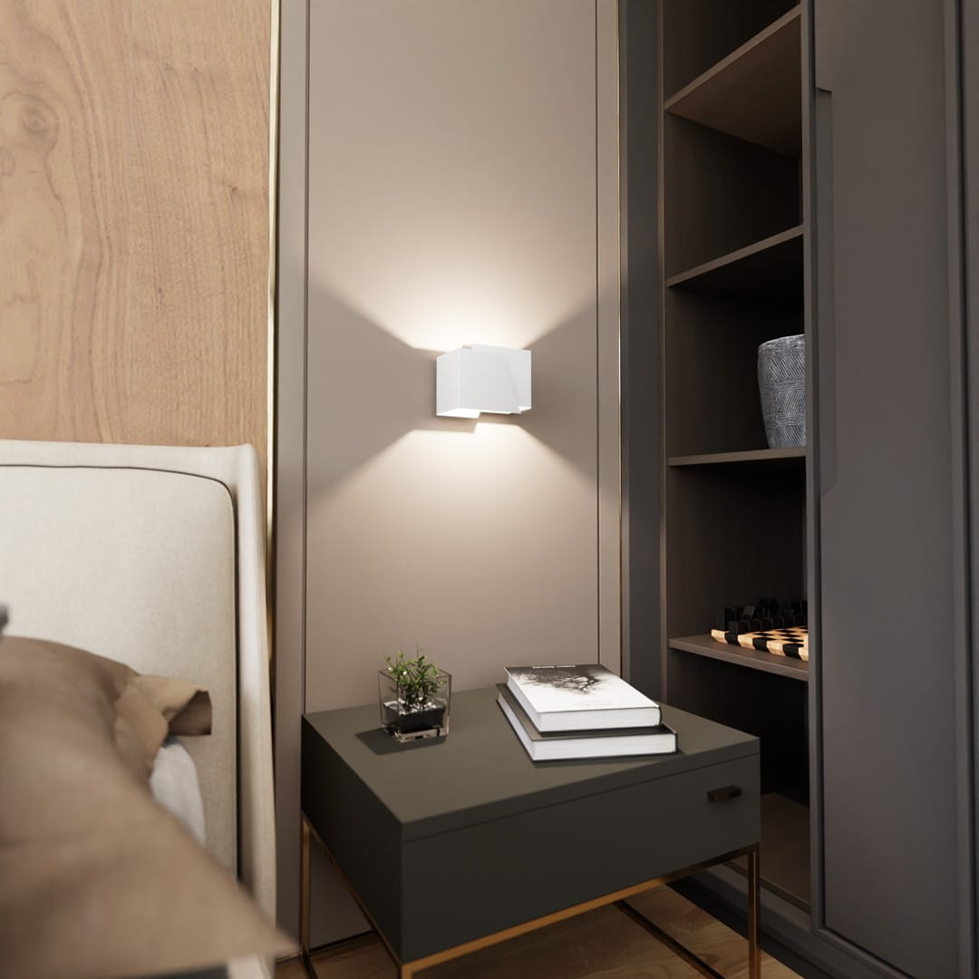 To, co wyróżnia tę kolekcję, to wyjątkowa forma inspirowana geometrią i architekturą. Korpus kinkietów ma kształt prostopadłościanu z asymetrycznymi ścięciami, które nadają lampom przestrzenny i nowoczesny charakter. Dwukierunkowe światło – skierowane ku górze i ku dołowi – tworzy ciekawe efekty świetlne na ścianie, jednocześnie zapewniając nastrojowe i dyskretne oświetlenie.