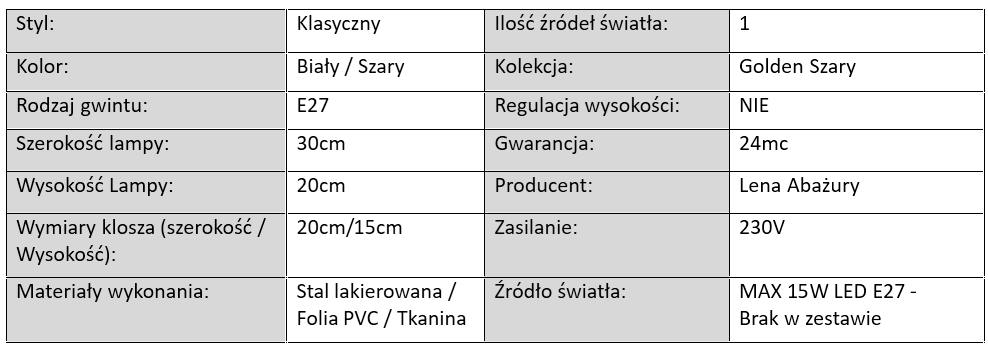 Lampy wiszące, sufitowe, podłogowe, kinkiety i lampki stołowe Golden Szary dostępne są w wersjach jednopunktowych, dwupunktowych oraz trzypunktowych, co pozwala dopasować je do każdego wnętrza – od niewielkich sypialni po przestronne salony. Każdy model został wyposażony w klasyczne gwinty E27, dzięki czemu z łatwością wybierzesz żarówki LED o odpowiedniej mocy i temperaturze barwowej.