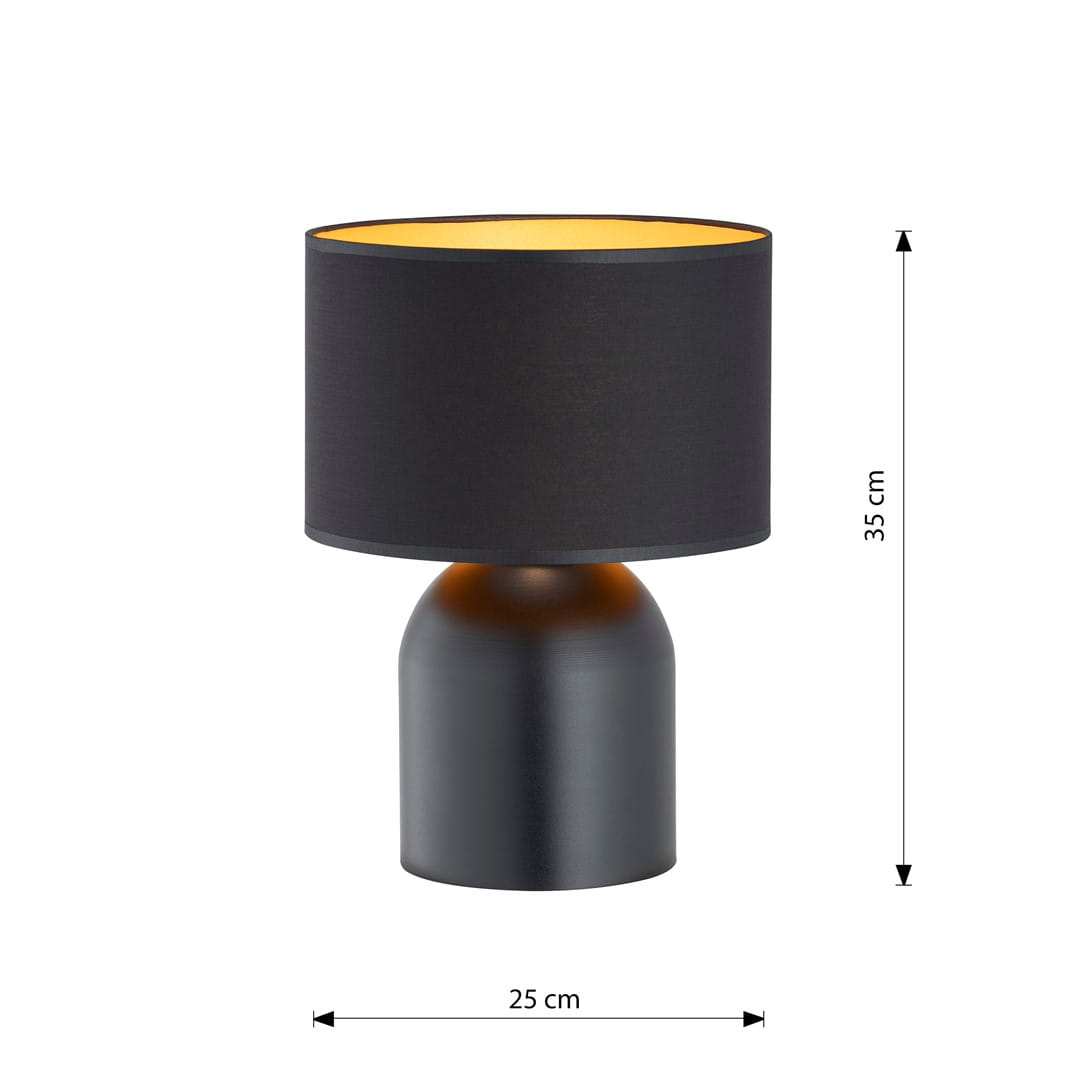 Czarna, matowa podstawa o zaokrąglonym, geometrycznym kształcie łączy się z prostym abażurem z tkaniny, tworząc ponadczasowy duet. Ciekawym detalem jest złote wnętrze klosza, które nadaje światłu wyjątkowo ciepły, nastrojowy charakter – idealny do relaksu, czytania czy wieczornego odpoczynku.