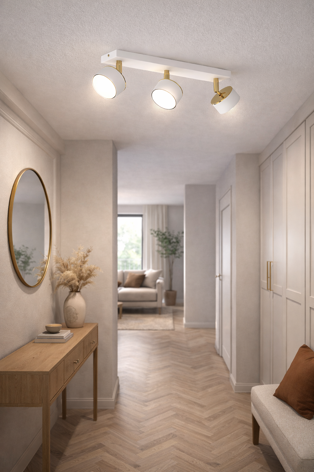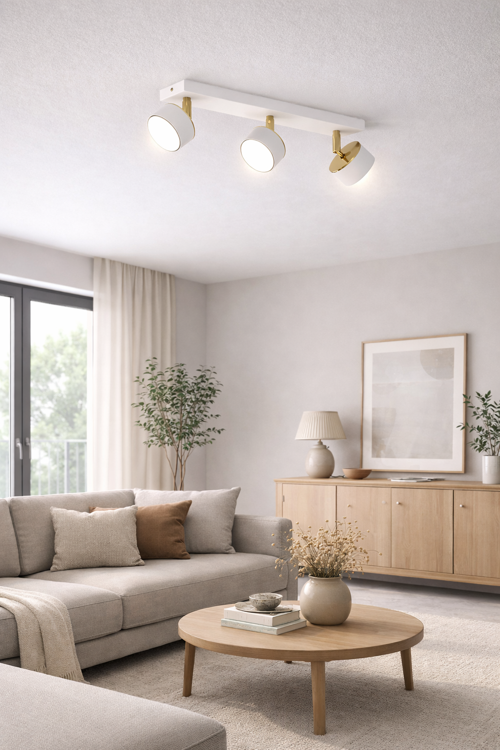 Lampa sufitowa Axis 3 biało-złota to eleganckie i funkcjonalne oświetlenie sufitowe, zaprojektowane z myślą o nowoczesnych wnętrzach. Trzy regulowane spoty zamontowane na minimalistycznej listwie pozwalają na precyzyjne doświetlenie przestrzeni oraz stworzenie komfortowej atmosfery w każdym pomieszczeniu.