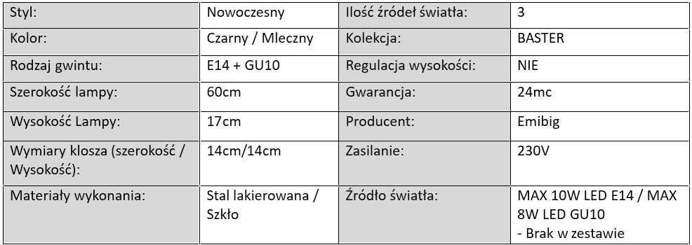 BASTER to linia lamp dostępnych w dwóch uniwersalnych wersjach kolorystycznych – eleganckiej czerni oraz subtelnej bieli. Każda lampa z tej kolekcji posiada charakterystyczny mleczny klosz z oprawką E14, który zapewnia przyjemne, rozproszone światło, idealne do stworzenia nastrojowej atmosfery w salonie, sypialni czy korytarzu.