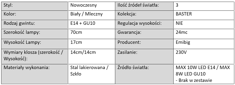 BASTER to linia lamp dostępnych w dwóch uniwersalnych wersjach kolorystycznych – eleganckiej czerni oraz subtelnej bieli. Każda lampa z tej kolekcji posiada charakterystyczny mleczny klosz z oprawką E14, który zapewnia przyjemne, rozproszone światło, idealne do stworzenia nastrojowej atmosfery w salonie, sypialni czy korytarzu.