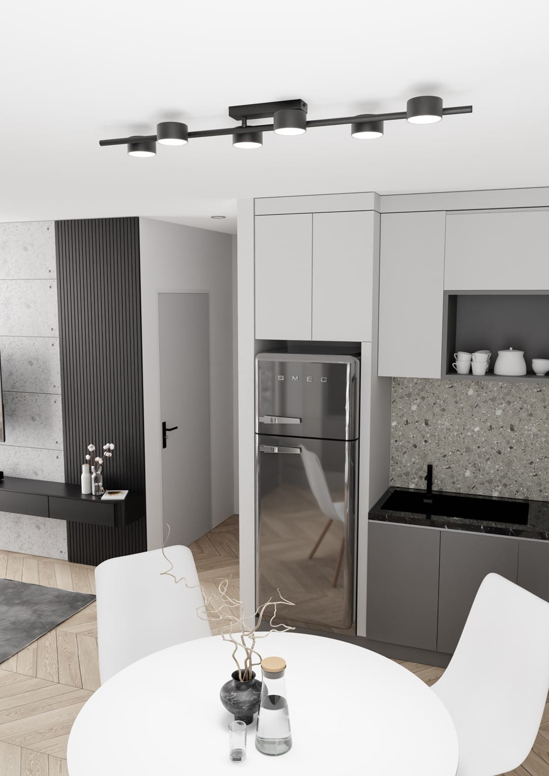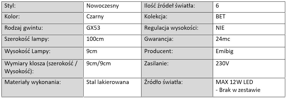Dostępne w wersjach 4- i 6-punktowych, lampy BET oferują intensywne, ale rozproszone światło, idealne do dużych pomieszczeń wymagających solidnego doświetlenia. Elegancki, czarny kolor oprawy nadaje im ponadczasowego charakteru i sprawia, że doskonale komponują się z wnętrzami urządzonymi w stylu loft, industrialnym, skandynawskim lub minimalistycznym.