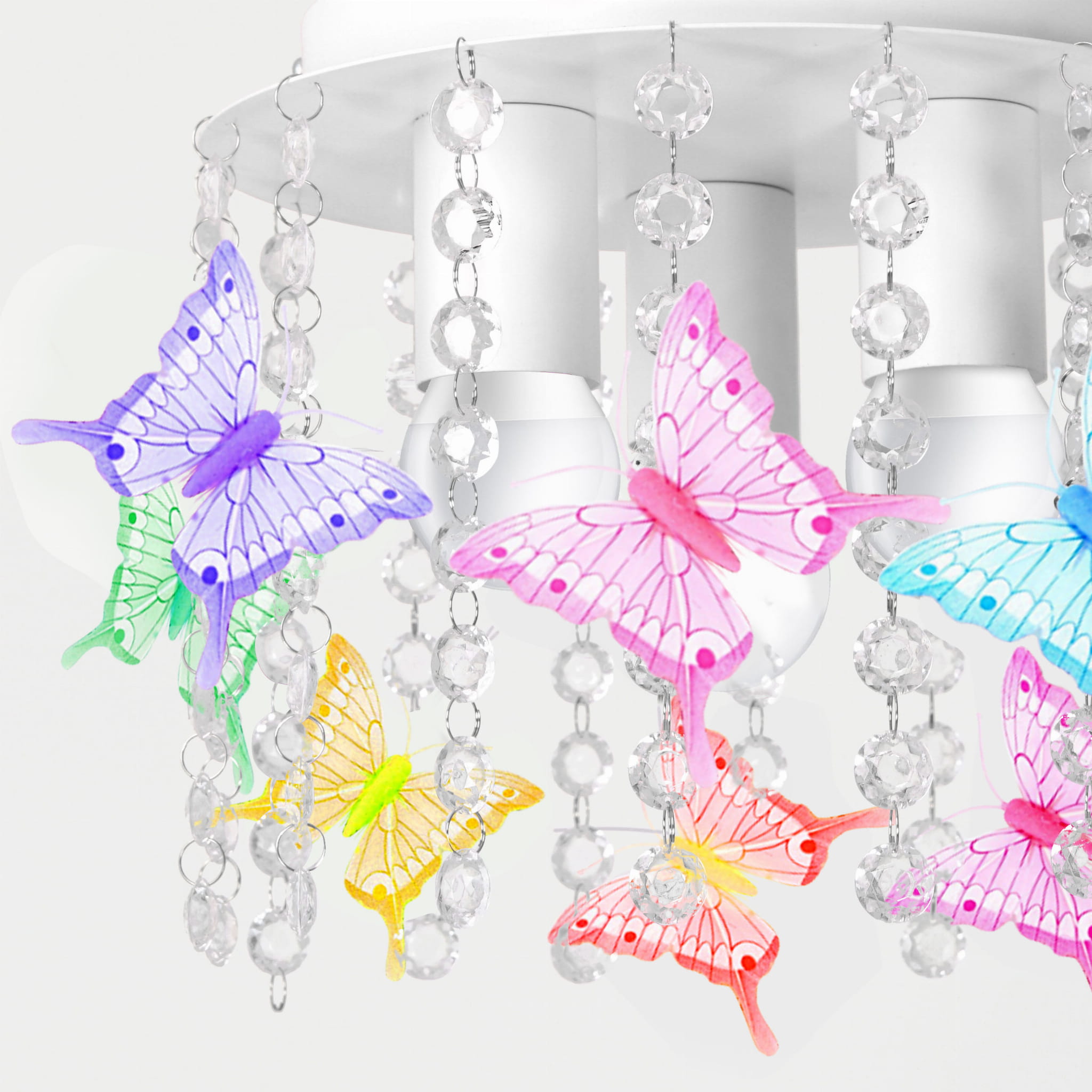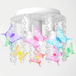 - Bajkowy design: Lampa ozdobiona jest delikatnymi kryształowymi zawieszkami oraz kolorowymi motylkami, które sprawiają, że każde włączenie światła zamienia pokój w magiczny zakątek. Motylki w pastelowych barwach (różowy, niebieski, fioletowy, zielony i żółty) nadają lampie lekkości i uroku.