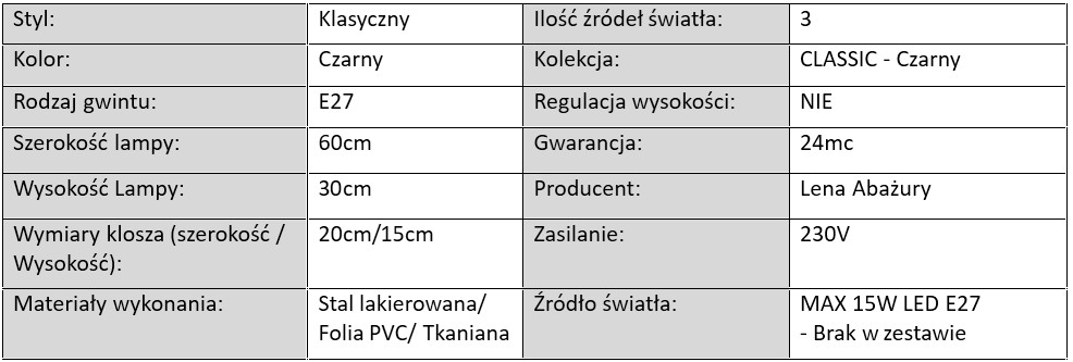 Lampy z serii CLASSIC – Czarny to nie tylko styl, ale także trwałość i funkcjonalność. Każdy model został zaprojektowany z dbałością o detal, co widać zarówno w wykończeniu abażurów, jak i w konstrukcji metalowych stelaży. Stelaże dostępne są w kolorze czarnym lub białym, wykonane z metalu malowanego proszkowo, dzięki czemu są odporne na zarysowania, uszkodzenia i działanie wilgoci.