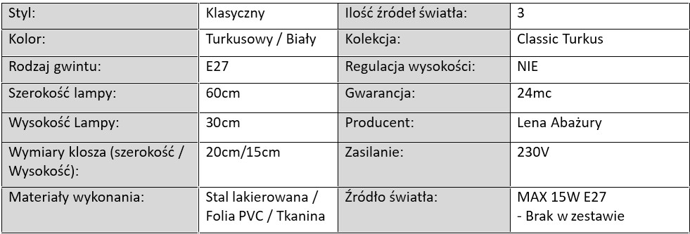 Lampa Sufitowa Classic Turkusowa / 3xE27