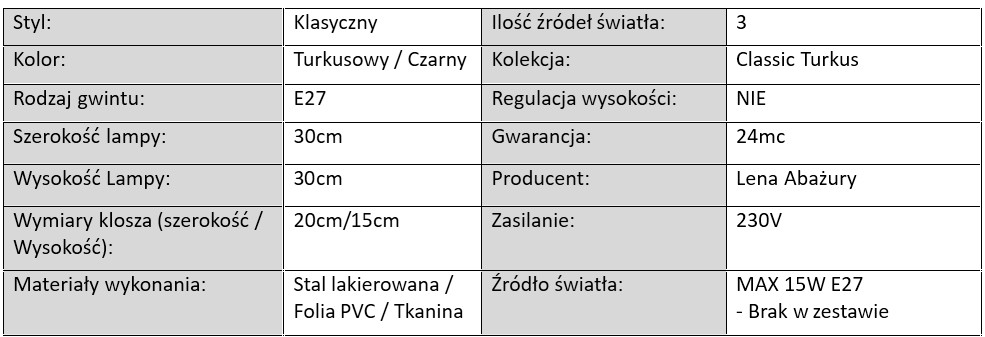 Każda lampa w tej serii wyróżnia się abażurem w pięknym turkusowym kolorze, od wewnątrz wykończonym białą folią PVC, co zapewnia równomierne i przyjemne dla oka rozproszenie światła. Stabilne i estetyczne stelaże dostępne są w wariantach kolorystycznych, które łatwo dopasujesz do swojego wnętrza. Wszystkie modele przystosowane są do żarówek z popularnym gwintem E27, dzięki czemu możesz swobodnie dobrać moc i barwę światła do swoich potrzeb.