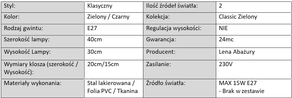 Lampy z serii Classic Butelkowa Zieleń wykonano z wysokiej jakości materiałów. Abażury pokryte są tkaniną w modnym odcieniu butelkowej zieleni, pod którą znajduje się biała folia PVC – zapewnia to równomierne, przyjemne dla oka rozproszenie światła. Całość uzupełniają metalowe stelaże w dwóch wersjach kolorystycznych: klasycznej bieli lub głębokiej czerni, co umożliwia idealne dopasowanie lamp do stylu wnętrza.