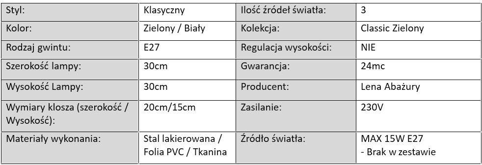 Lampy z serii Classic Butelkowa Zieleń wykonano z wysokiej jakości materiałów. Abażury pokryte są tkaniną w modnym odcieniu butelkowej zieleni, pod którą znajduje się biała folia PVC – zapewnia to równomierne, przyjemne dla oka rozproszenie światła. Całość uzupełniają metalowe stelaże w dwóch wersjach kolorystycznych: klasycznej bieli lub głębokiej czerni, co umożliwia idealne dopasowanie lamp do stylu wnętrza.