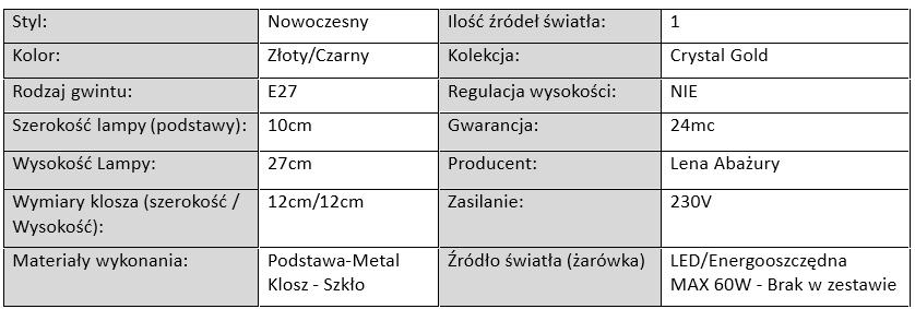 Każda lampa z kolekcji Crystal Gold została wykonana z najwyższej jakości materiałów. Połyskujące złote klosze w połączeniu z transparentnym szkłem tworzą subtelną grę światła, dodając wnętrzu wyjątkowego charakteru.
