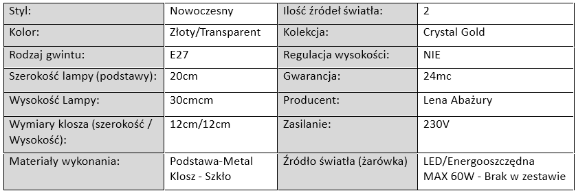 Kolekcja Crystal Gold to wyjątkowe lampy, które łączą w sobie nowoczesny design, elegancję oraz funkcjonalność. To idealne rozwiązanie dla osób poszukujących stylowego oświetlenia do wnętrza, które podkreśli charakter pomieszczenia i nada mu luksusowego wyglądu. W skład kolekcji wchodzą lampy wiszące, lampy sufitowe, kinkiety, lampy stołowe oraz lampki nocne, które doskonale sprawdzą się zarówno w salonie, sypialni, jadalni, jak i w eleganckim biurze czy hotelowym apartamencie.