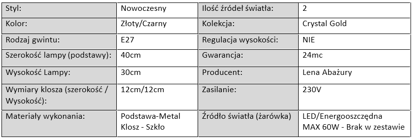 Każda lampa z kolekcji Crystal Gold została wykonana z najwyższej jakości materiałów. Połyskujące złote klosze w połączeniu z transparentnym szkłem tworzą subtelną grę światła, dodając wnętrzu wyjątkowego charakteru.