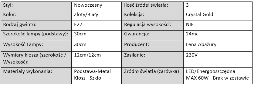 Kolekcja Crystal Gold to wyjątkowe lampy, które łączą w sobie nowoczesny design, elegancję oraz funkcjonalność. To idealne rozwiązanie dla osób poszukujących stylowego oświetlenia do wnętrza, które podkreśli charakter pomieszczenia i nada mu luksusowego wyglądu. W skład kolekcji wchodzą lampy wiszące, lampy sufitowe, kinkiety, lampy stołowe oraz lampki nocne, które doskonale sprawdzą się zarówno w salonie, sypialni, jadalni, jak i w eleganckim biurze czy hotelowym apartamencie.