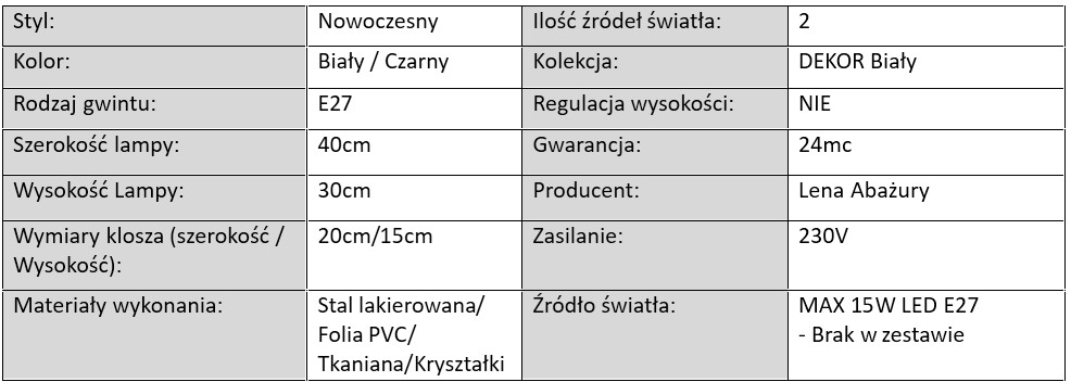 Lampy z kolekcji Dekor Biały to propozycja dla osób ceniących połączenie subtelnej elegancji, ponadczasowego stylu i funkcjonalności. Białe abażury ze stylowym wykończeniem w postaci ozdobnego pasa z kryształków nadają oprawom świetlnym luksusowy charakter, a biała folia wewnątrz klosza dodatkowo wzmacnia rozchodzenie się światła, tworząc we wnętrzu przyjemną i ciepłą atmosferę.