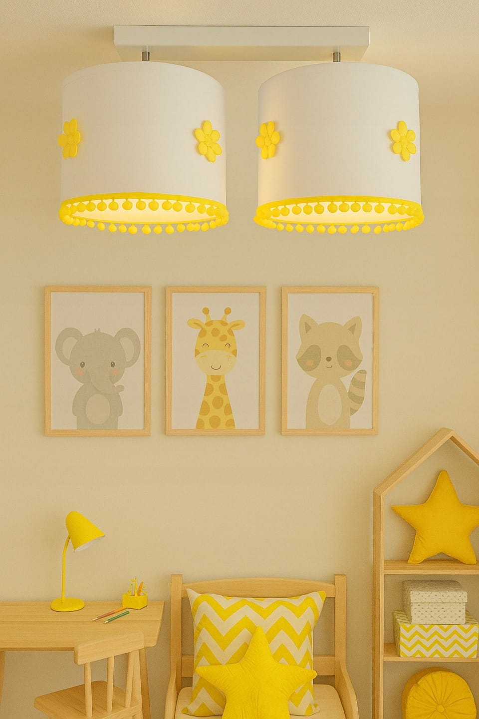 ✅Na dolnej krawędzi abażuru znajdują się pluszowe pompony w kolorze żółtym.