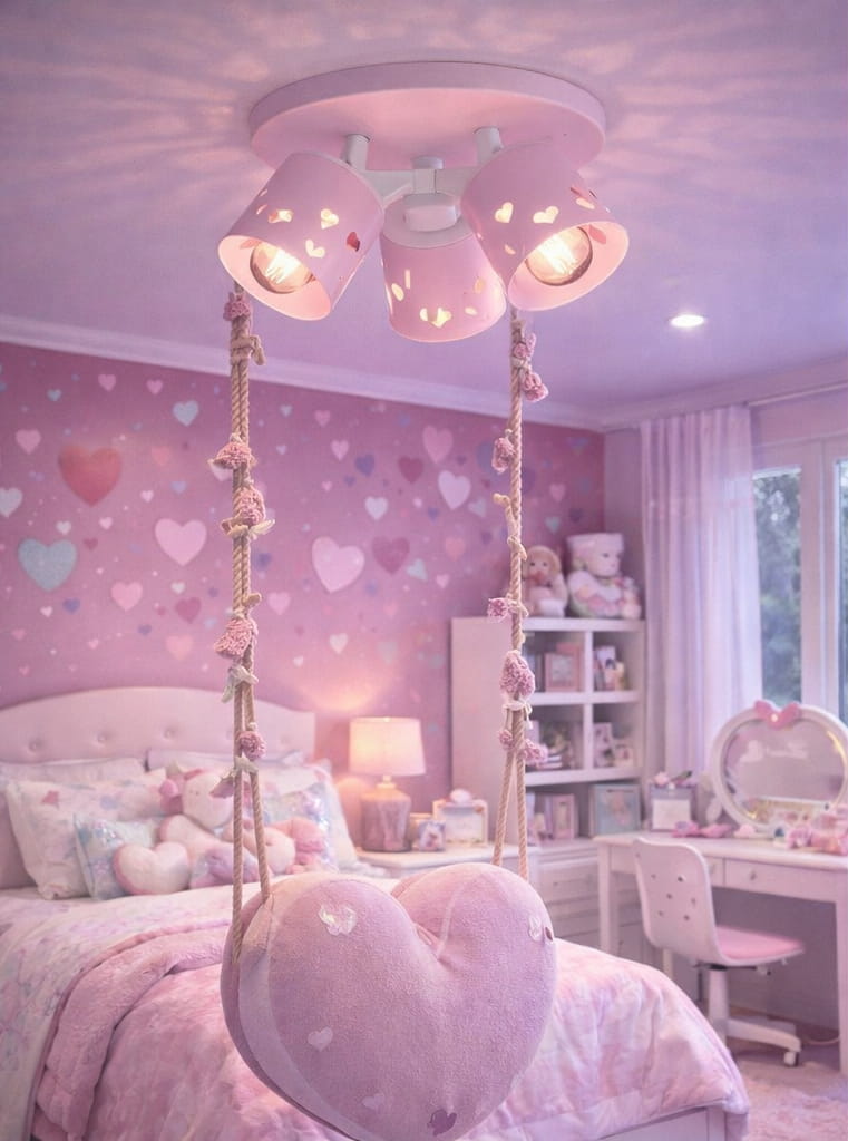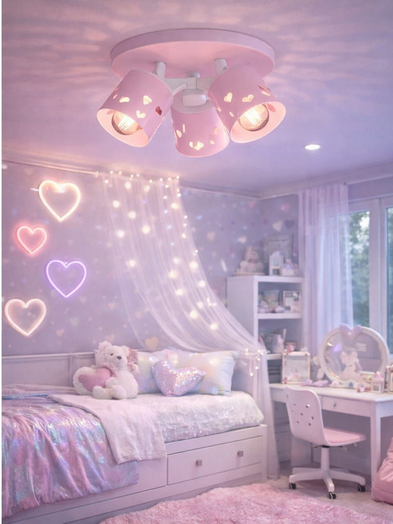 Ażurowe wycięcia w kształcie serc delikatnie przepuszczają światło, tworząc miękkie refleksy na ścianach i suficie. Dzięki temu lampa nie tylko oświetla pomieszczenie, ale również pełni funkcję dekoracyjną, nadając wnętrzu bajkowego, dziewczęcego charakteru.