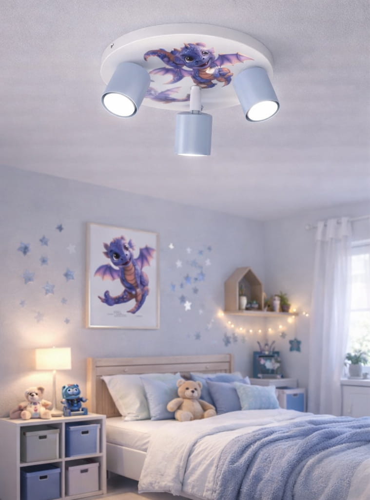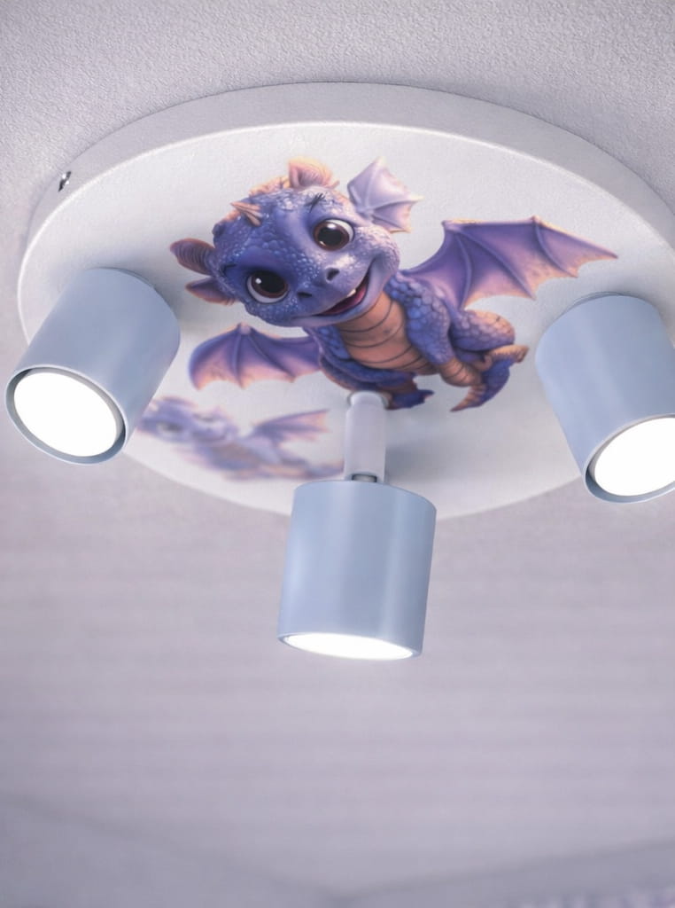 Jeśli szukasz lampy sufitowej do pokoju dziecka, która łączy funkcjonalność z bajkowym designem, model LumiDreams – Smoczki Niebieskie będzie doskonałym wyborem. To praktyczne, 3-punktowe oświetlenie dziecięce, które nada wnętrzu wyjątkowy, magiczny klimat i sprawi, że codzienna zabawa stanie się jeszcze bardziej niezwykła.