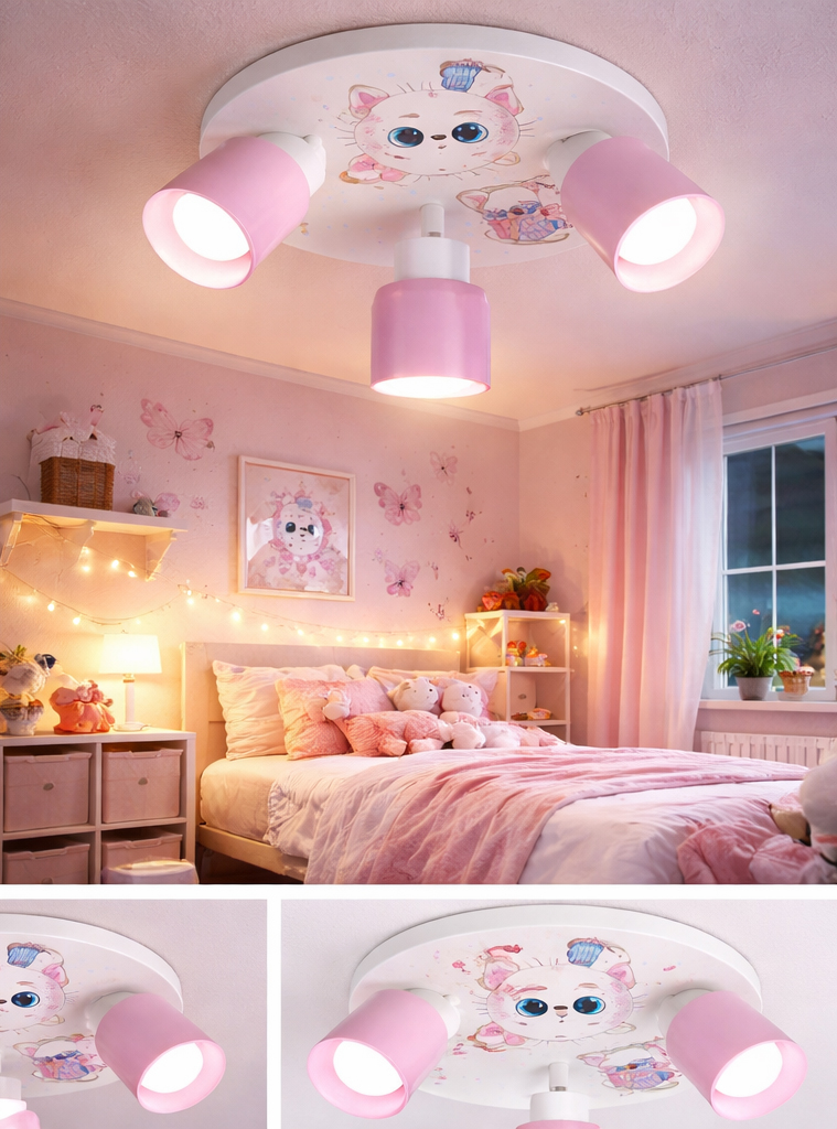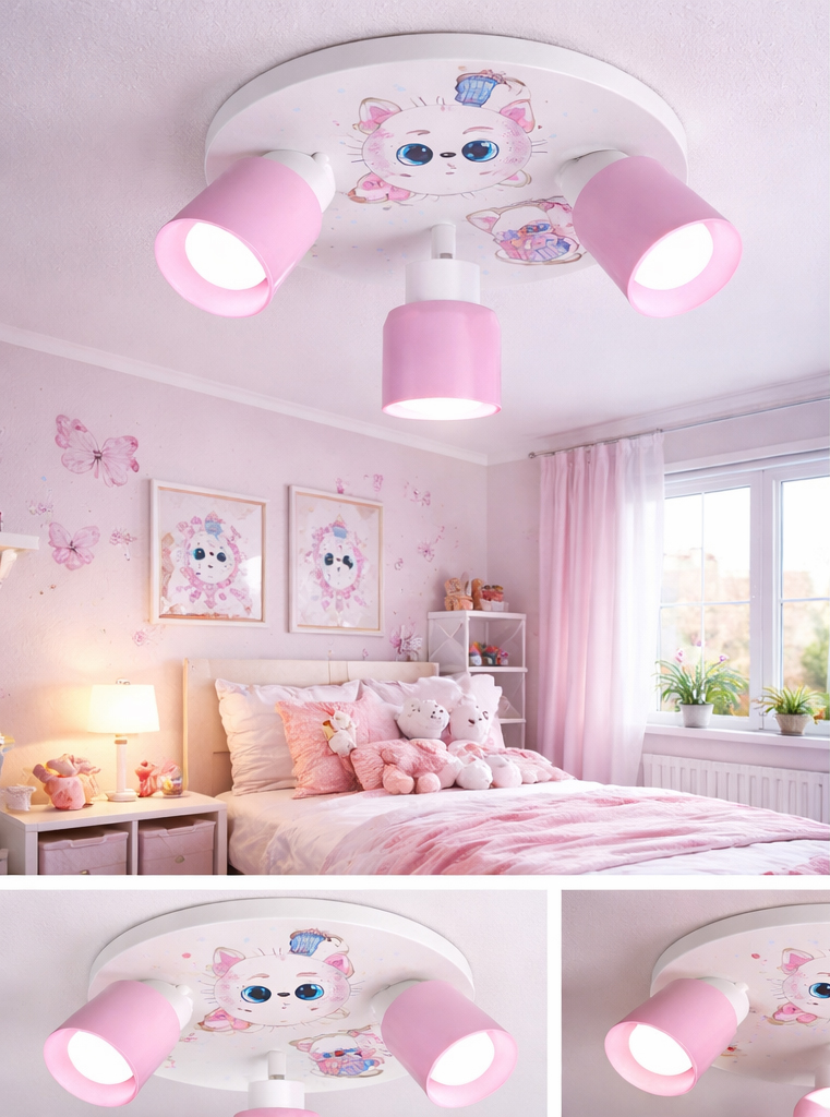 Jeśli szukasz lampy sufitowej do pokoju dziecka z gwintem E27, która połączy funkcjonalność z uroczym, dziewczęcym designem, LumiDreams – Kotek z Babeczką Różowy E27 będzie doskonałym wyborem. To praktyczne, 3-punktowe oświetlenie dziecięce, które stworzy ciepłą i radosną atmosferę każdego dnia.