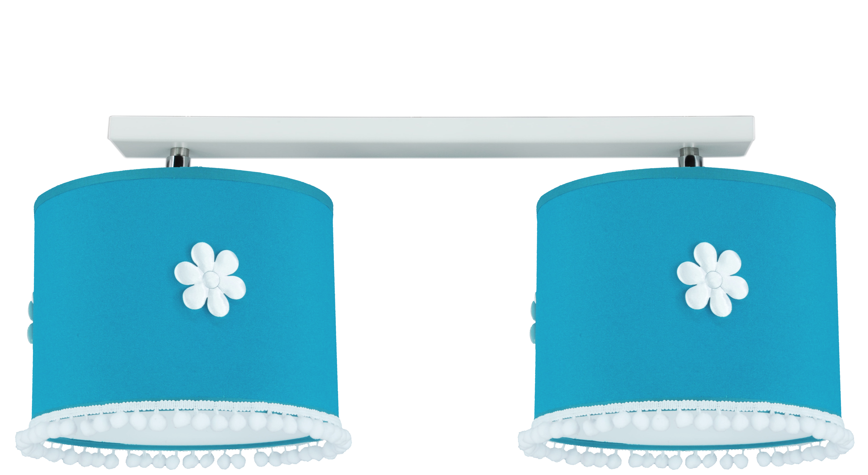 Abażury w kolorze niebieskim wykonane są z wysokiej jakości materiału i wykończone od wewnątrz białą folią odbijającą światło, co zapewnia przyjemną, miękką poświatę – idealną do odpoczynku, zabawy lub wieczornego wyciszenia. Każdy abażur ozdobiony jest trzema uroczymi, białymi kwiatuszkami, które dodają lampie dziecięcego uroku, a całość wieńczy białe pluszowe pąpony – miękkie i subtelne, delikatnie poruszające się przy ruchu powietrza.