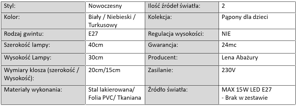 Białe metalowe stelaże są solidne, trwałe i odporne na uszkodzenia – doskonale komponują się z kolorystyką abażurów, tworząc spójną, subtelną całość. Niezależnie od tego, czy urządzisz pokój w stylu skandynawskim, klasycznym czy pastelowym – lampy z kolekcji Pąpony Niebieskie idealnie wpiszą się w przestrzeń dziecięcego świata.