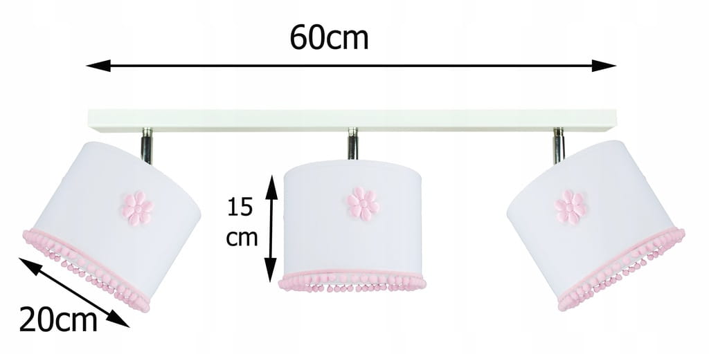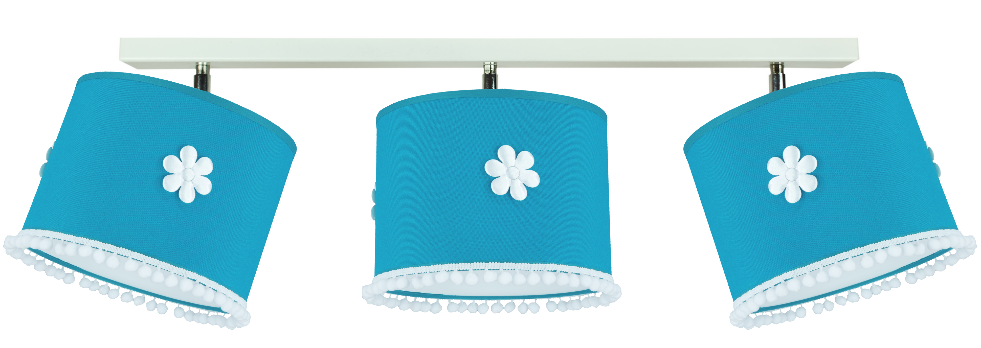 Abażury w kolorze niebieskim wykonane są z wysokiej jakości materiału i wykończone od wewnątrz białą folią odbijającą światło, co zapewnia przyjemną, miękką poświatę – idealną do odpoczynku, zabawy lub wieczornego wyciszenia. Każdy abażur ozdobiony jest trzema uroczymi, białymi kwiatuszkami, które dodają lampie dziecięcego uroku, a całość wieńczy białe pluszowe pąpony – miękkie i subtelne, delikatnie poruszające się przy ruchu powietrza.