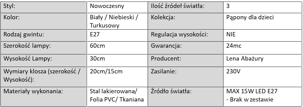 Białe metalowe stelaże są solidne, trwałe i odporne na uszkodzenia – doskonale komponują się z kolorystyką abażurów, tworząc spójną, subtelną całość. Niezależnie od tego, czy urządzisz pokój w stylu skandynawskim, klasycznym czy pastelowym – lampy z kolekcji Pąpony Niebieskie idealnie wpiszą się w przestrzeń dziecięcego świata.