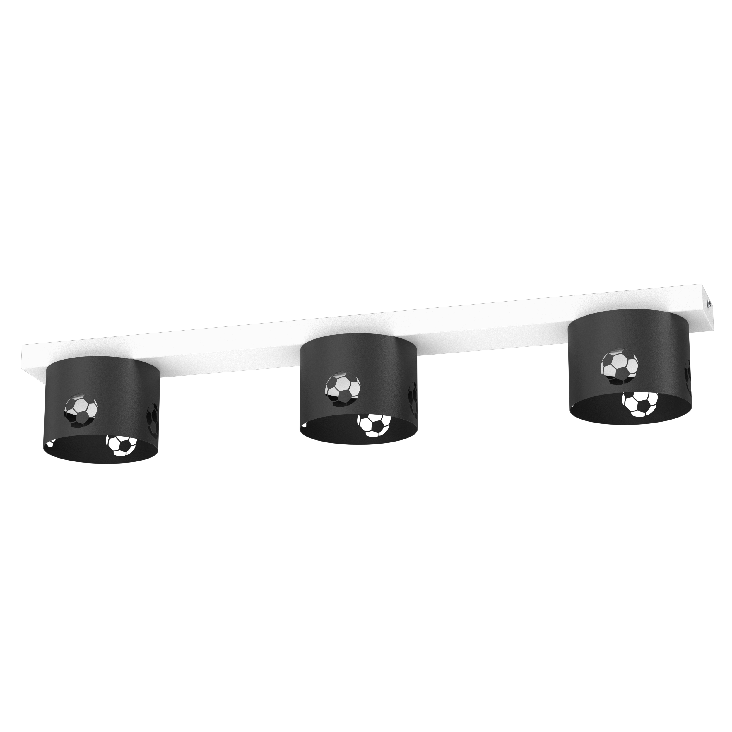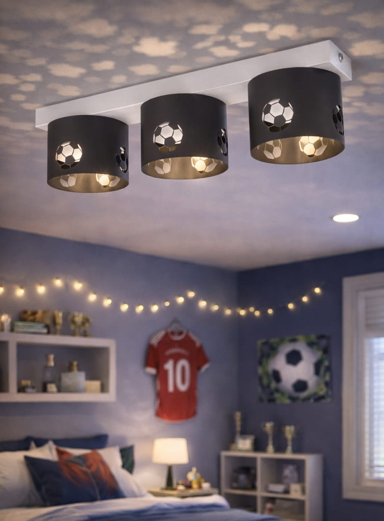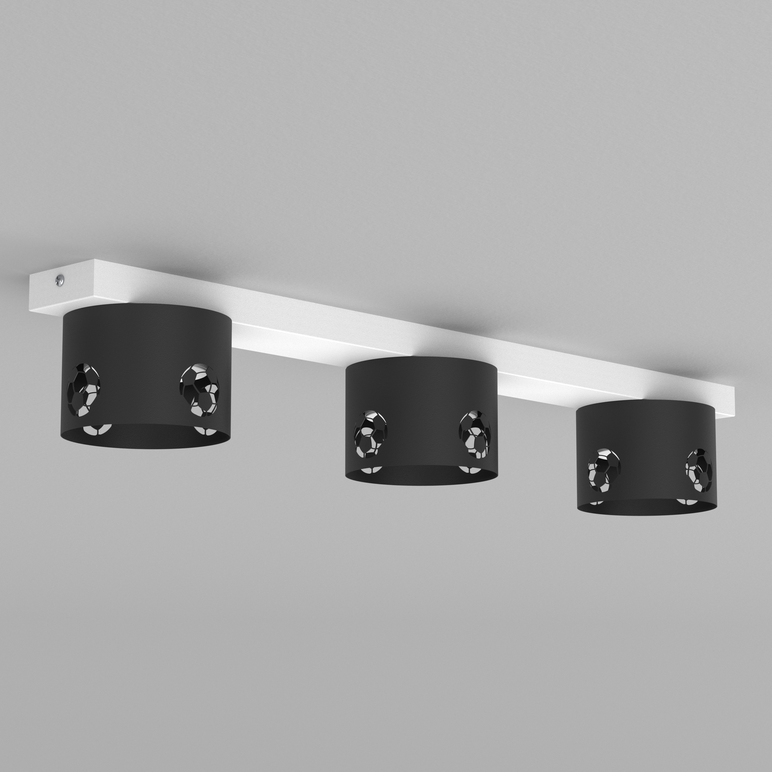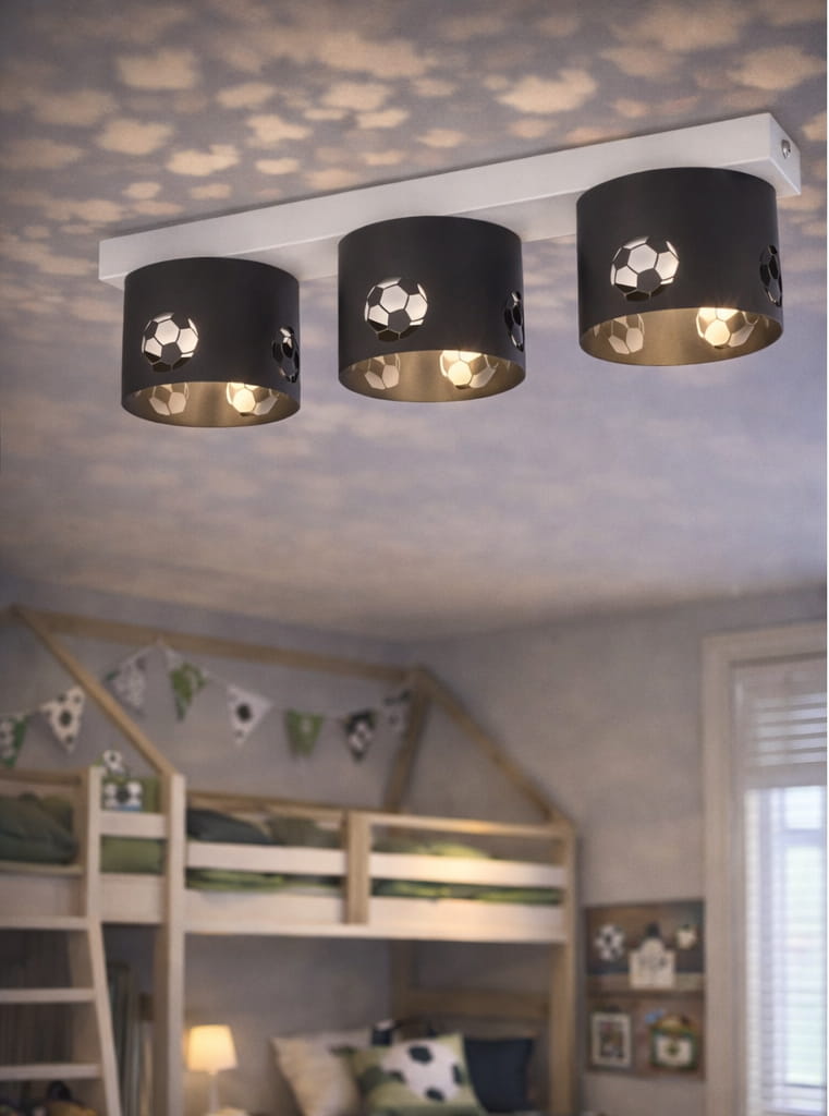 Nowoczesna lampa sufitowa z kolekcji FOOTBALL, zaprojektowana z myślą o pokoju dziecka oraz młodego fana piłki nożnej. Trzy czarne klosze z dekoracyjnym, ażurowym motywem piłek nożnych nadają wnętrzu sportowego charakteru, jednocześnie zachowując estetykę i funkcjonalność codziennego oświetlenia.