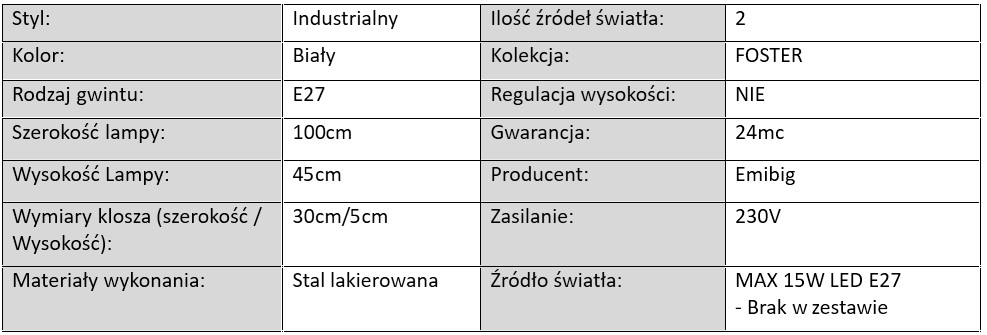 Cała kolekcja została wykonana z trwałego metalu malowanego proszkowo, dostępnego w dwóch klasycznych kolorach: matowej czerni i eleganckiej bieli. Dzięki temu lampy FOSTER świetnie komponują się zarówno z jasnymi, jak i ciemniejszymi przestrzeniami – od nowoczesnych apartamentów po przestrzenie biurowe, restauracyjne czy loftowe.