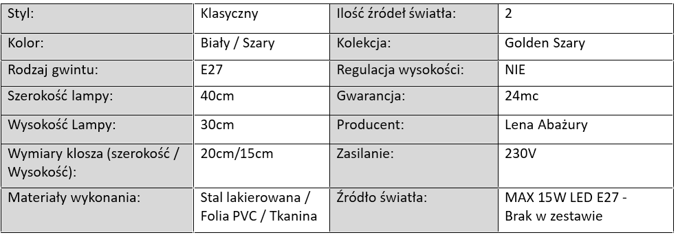 Lampy wiszące, sufitowe, podłogowe, kinkiety i lampki stołowe Golden Szary dostępne są w wersjach jednopunktowych, dwupunktowych oraz trzypunktowych, co pozwala dopasować je do każdego wnętrza – od niewielkich sypialni po przestronne salony. Każdy model został wyposażony w klasyczne gwinty E27, dzięki czemu z łatwością wybierzesz żarówki LED o odpowiedniej mocy i temperaturze barwowej.