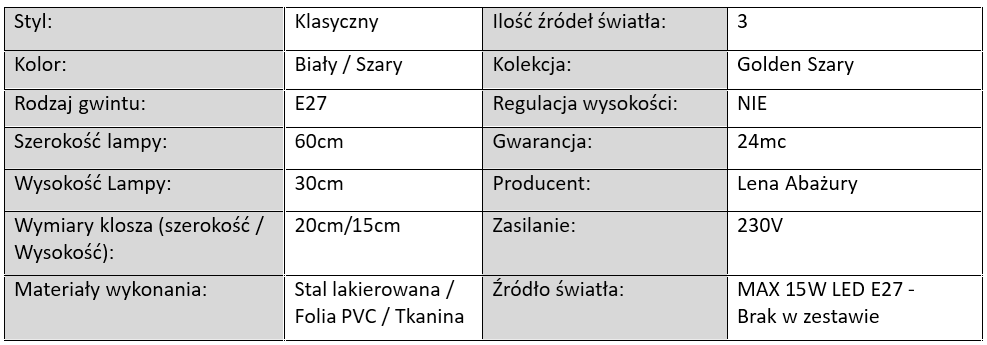 Lampy wiszące, sufitowe, podłogowe, kinkiety i lampki stołowe Golden Szary dostępne są w wersjach jednopunktowych, dwupunktowych oraz trzypunktowych, co pozwala dopasować je do każdego wnętrza – od niewielkich sypialni po przestronne salony. Każdy model został wyposażony w klasyczne gwinty E27, dzięki czemu z łatwością wybierzesz żarówki LED o odpowiedniej mocy i temperaturze barwowej.