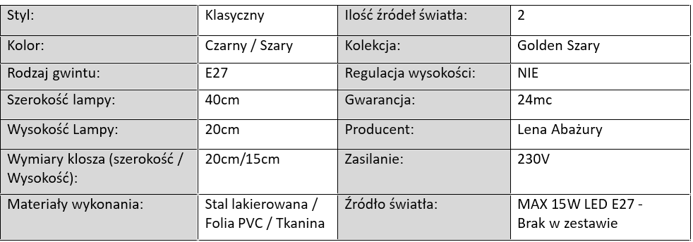 Lampy wiszące, sufitowe, podłogowe, kinkiety i lampki stołowe Golden Szary dostępne są w wersjach jednopunktowych, dwupunktowych oraz trzypunktowych, co pozwala dopasować je do każdego wnętrza – od niewielkich sypialni po przestronne salony. Każdy model został wyposażony w klasyczne gwinty E27, dzięki czemu z łatwością wybierzesz żarówki LED o odpowiedniej mocy i temperaturze barwowej.
