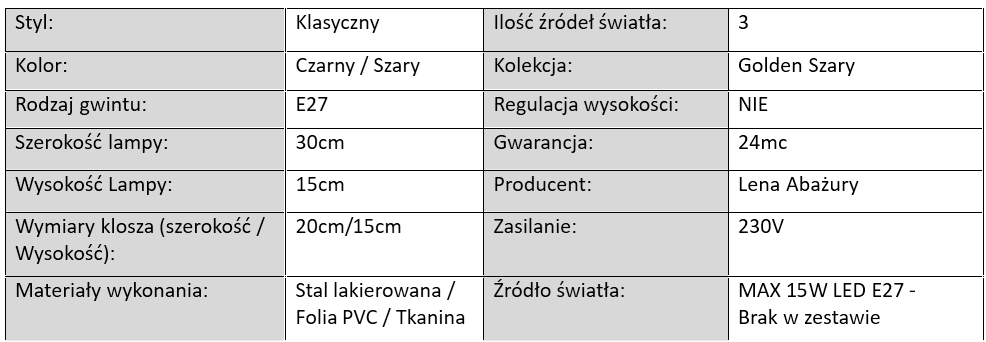 Lampy wiszące, sufitowe, podłogowe, kinkiety i lampki stołowe Golden Szary dostępne są w wersjach jednopunktowych, dwupunktowych oraz trzypunktowych, co pozwala dopasować je do każdego wnętrza – od niewielkich sypialni po przestronne salony. Każdy model został wyposażony w klasyczne gwinty E27, dzięki czemu z łatwością wybierzesz żarówki LED o odpowiedniej mocy i temperaturze barwowej.