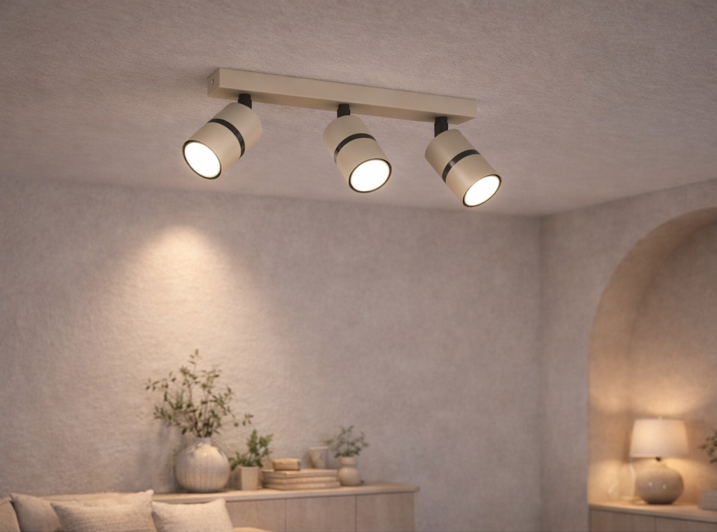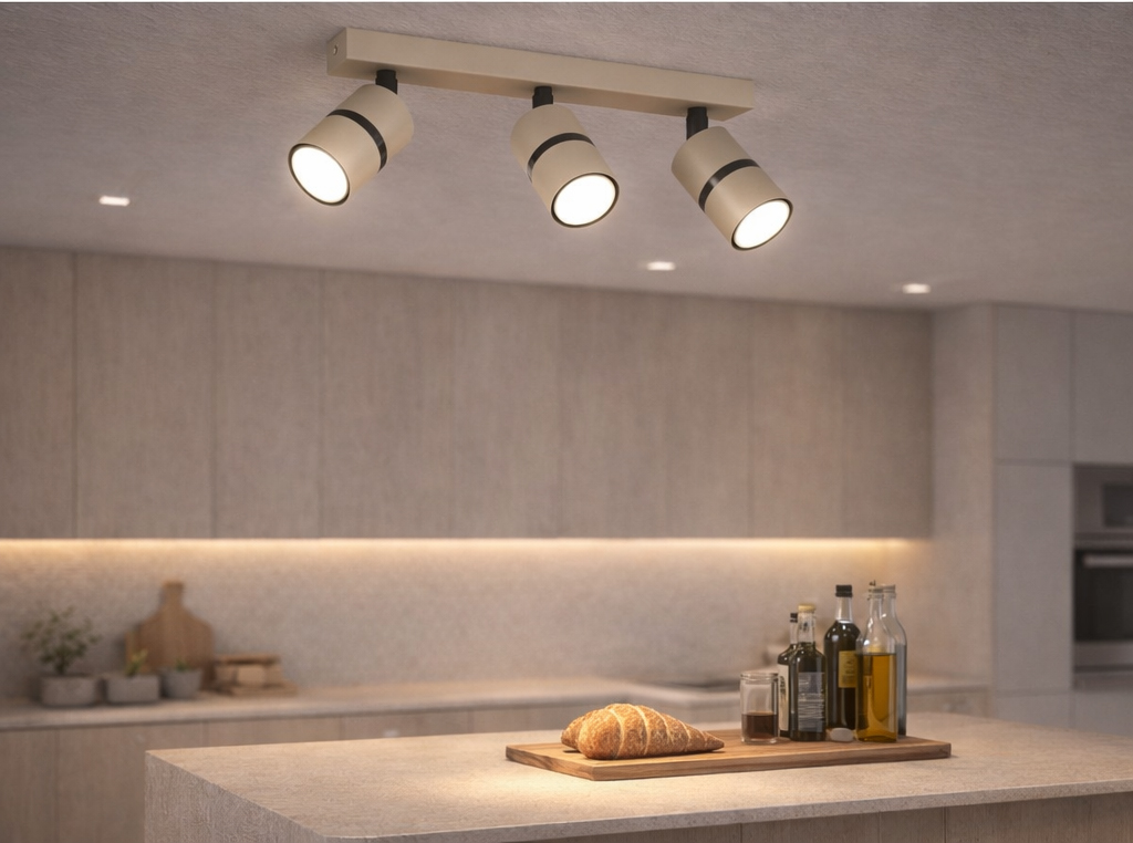 Aurora Black Beżowa 3 to nowoczesna lampa sufitowa z trzema regulowanymi reflektorami, która łączy minimalistyczny design z maksymalną funkcjonalnością. Beżowa listwa sufitowa w zestawieniu z czarnymi elementami konstrukcyjnymi oraz subtelnym czarnym akcentem na kloszach tworzy elegancką i ponadczasową kompozycję.