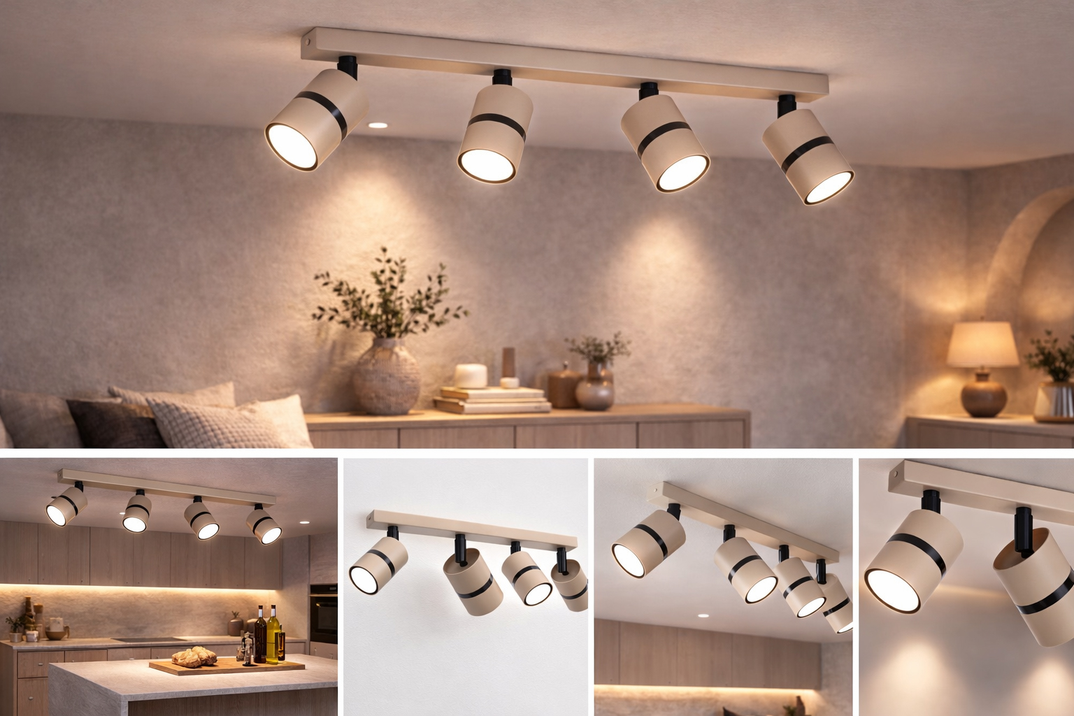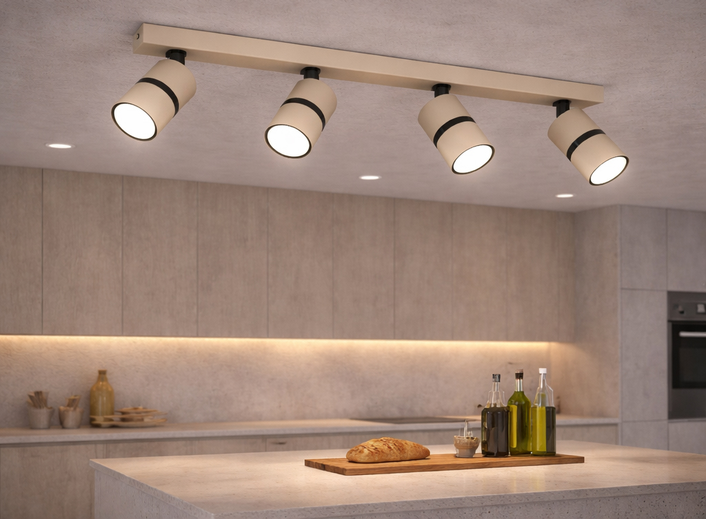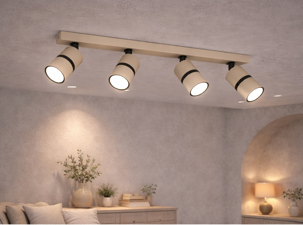 Aurora Black Beżowa 4 to nowoczesna lampa sufitowa z czterema regulowanymi reflektorami, zaprojektowana z myślą o większych przestrzeniach i maksymalnej funkcjonalności. Beżowa listwa sufitowa w połączeniu z czarnymi elementami konstrukcyjnymi oraz subtelnym czarnym akcentem na kloszach tworzy elegancką, spójną i ponadczasową całość.