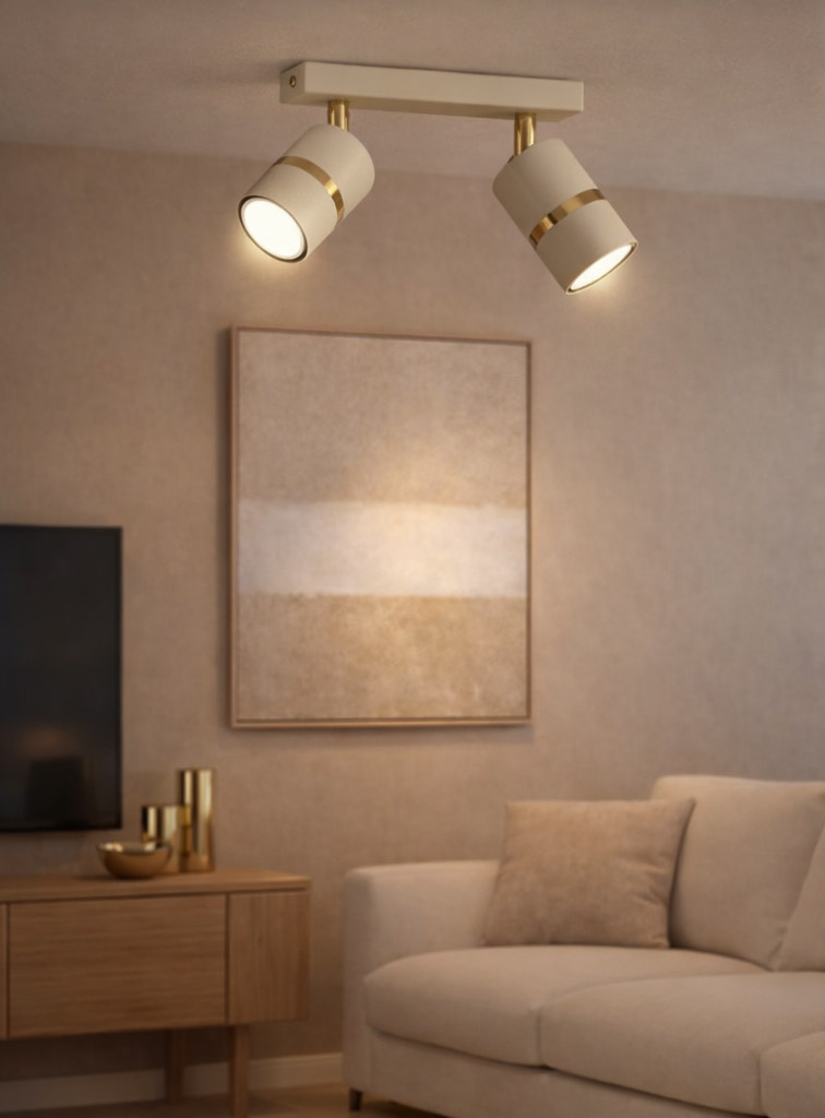 Aurora Gold Beżowa podwójna to stylowa lampa sufitowa, która podkreśla charakter nowoczesnych wnętrz i zapewnia funkcjonalne, punktowe oświetlenie przestrzeni.