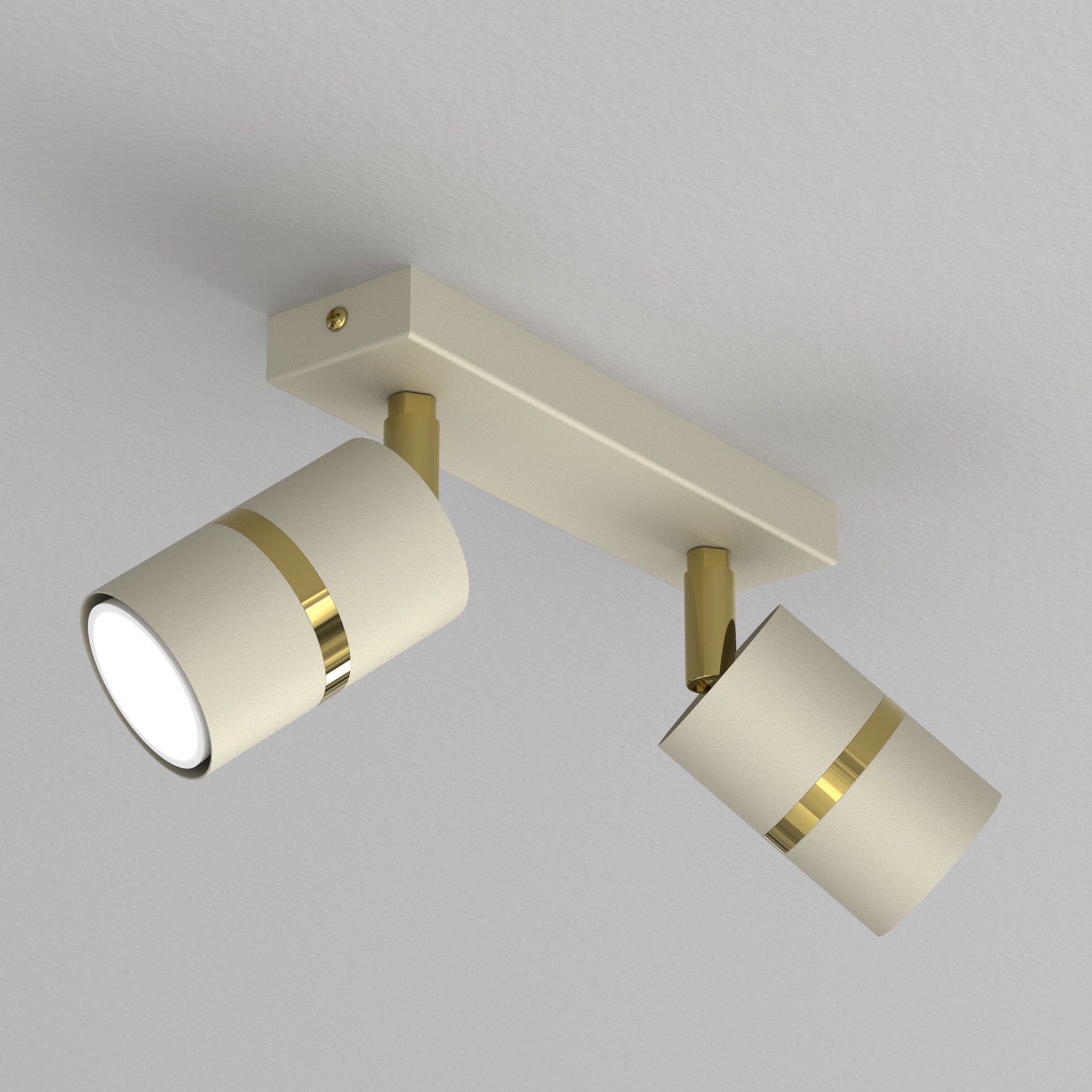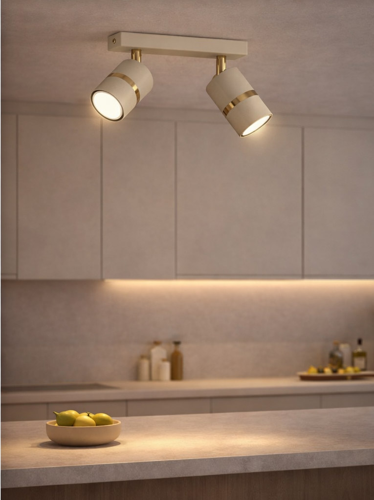 Lampa sufitowa Aurora Gold Beżowa podwójna to nowoczesna oprawa oświetleniowa typu spot, która łączy minimalistyczny design z eleganckim wykończeniem. Dwa cylindryczne reflektory w modnym beżowym kolorze zostały osadzone na stylowej listwie sufitowej i ozdobione subtelnym złotym detalem, który dodaje lampie wyjątkowego charakteru.