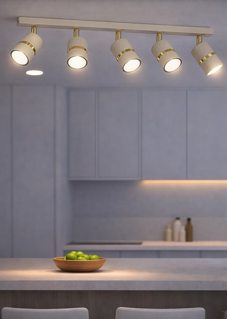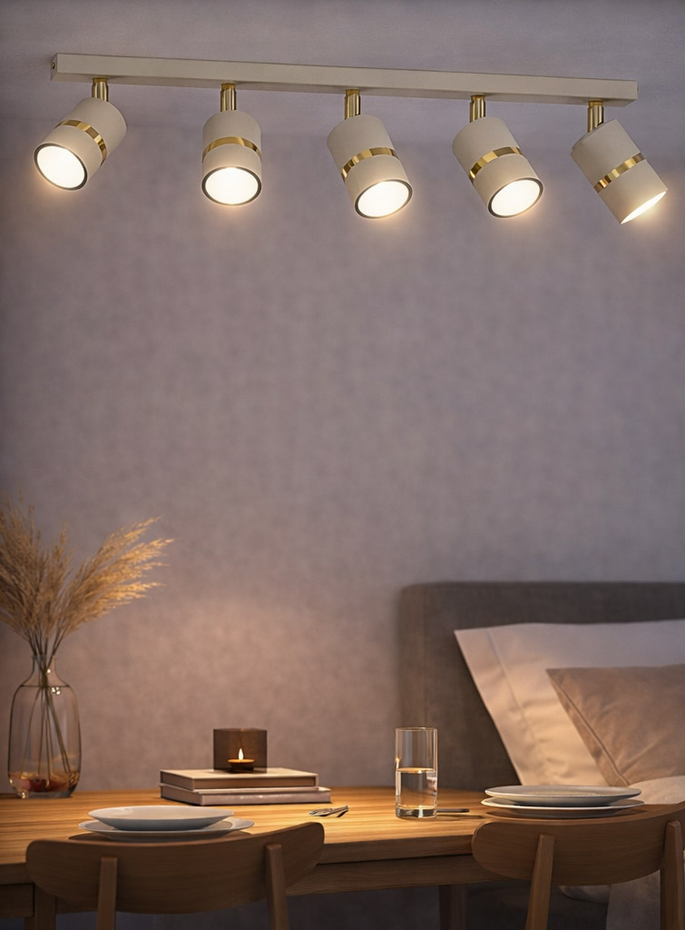 Lampa sufitowa Aurora Gold Beżowa pięciopunktowa to nowoczesne i funkcjonalne oświetlenie, które łączy minimalistyczny design z eleganckimi złotymi detalami. Pięć cylindrycznych reflektorów w modnym beżowym kolorze zostało zamontowanych na długiej listwie sufitowej, tworząc stylową oprawę idealną do nowoczesnych wnętrz.