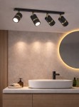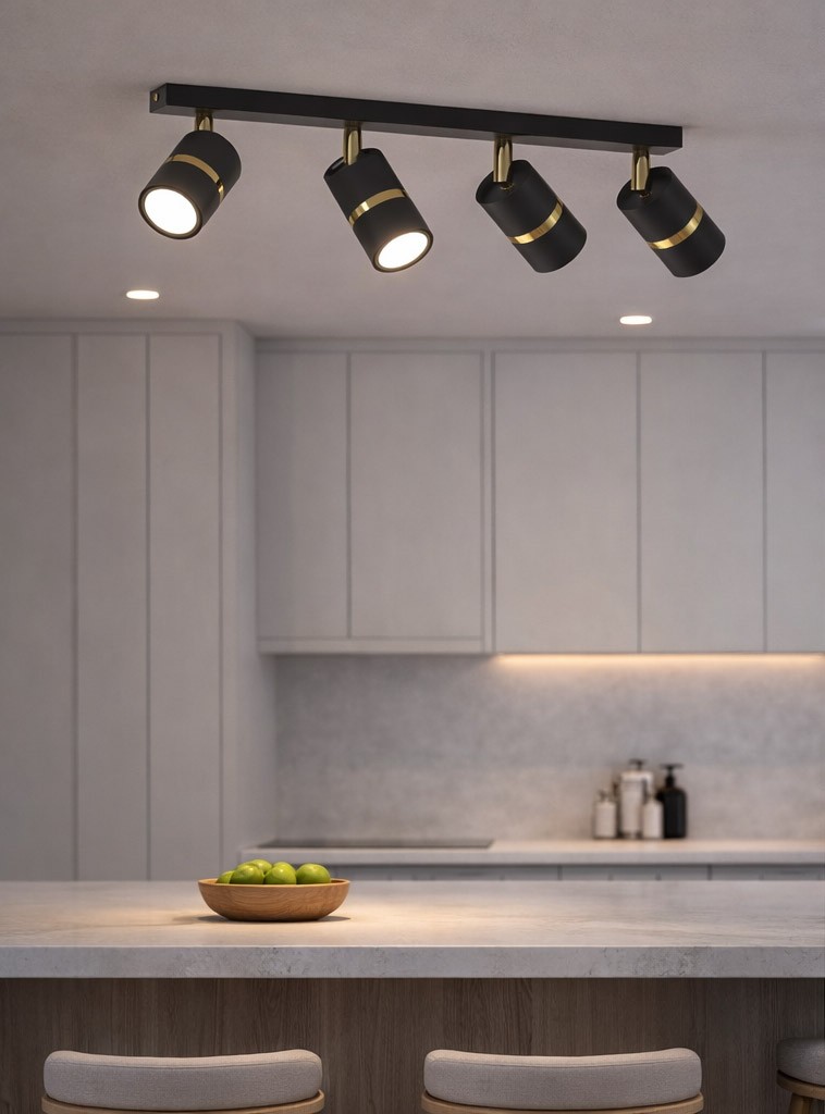 Lampa sufitowa AURORA GOLD Czarna czteropunktowa to nowoczesna oprawa oświetleniowa typu spot, która łączy minimalistyczny design z eleganckimi złotymi detalami. Cztery cylindryczne reflektory w matowej czerni, ozdobione subtelnym złotym pierścieniem, zostały zamontowane na podłużnej podsufitce, tworząc funkcjonalne i stylowe oświetlenie do współczesnych wnętrz.