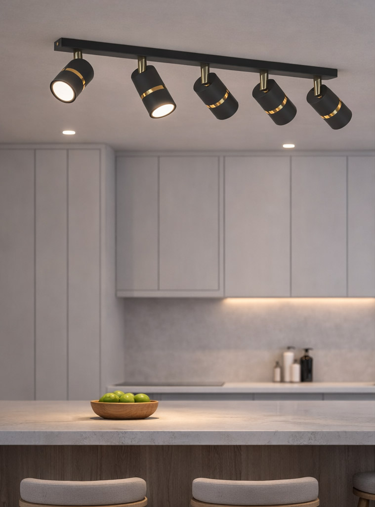 Lampa sufitowa AURORA GOLD Czarna pięciopunktowa to nowoczesna oprawa oświetleniowa typu spot, która łączy minimalistyczny design z eleganckimi złotymi detalami. Pięć cylindrycznych reflektorów w matowej czerni zostało osadzonych na podłużnej listwie sufitowej, tworząc stylowe i funkcjonalne oświetlenie do nowoczesnych wnętrz.