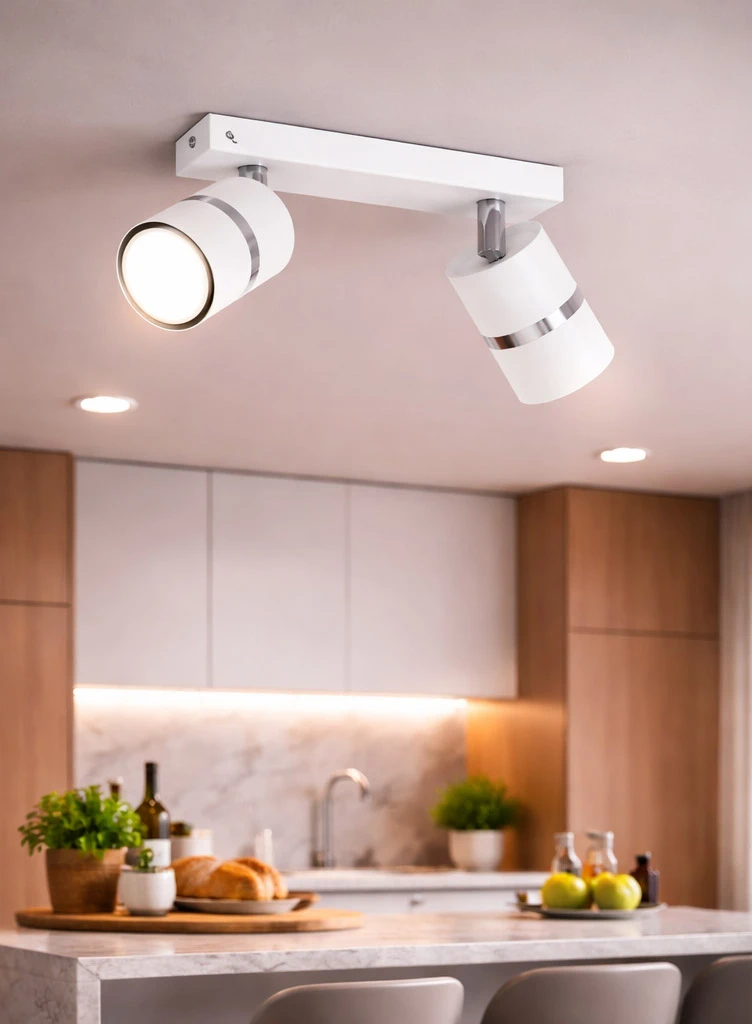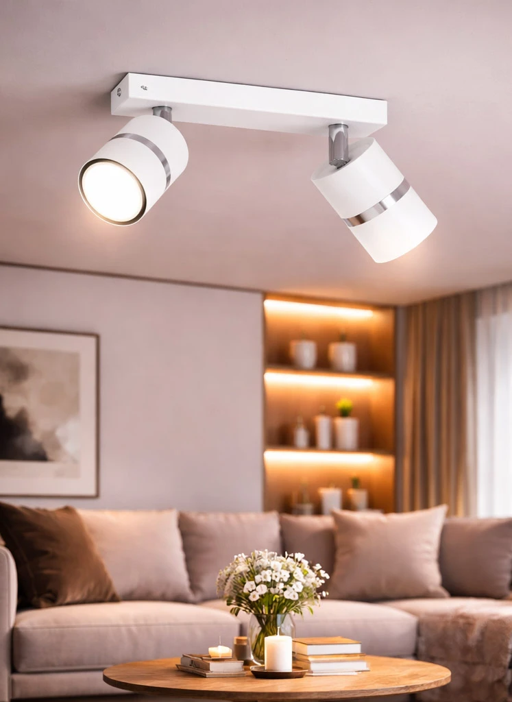 Szukasz funkcjonalnego i stylowego oświetlenia do nowoczesnego wnętrza? Lampa sufitowa Aurora Silver Biała 2-punktowa to idealne rozwiązanie, które łączy minimalistyczny design z praktycznym zastosowaniem. Dwa regulowane reflektory w eleganckim białym kolorze ze srebrnym detalem tworzą nowoczesną i spójną formę, idealną do wielu aranżacji.