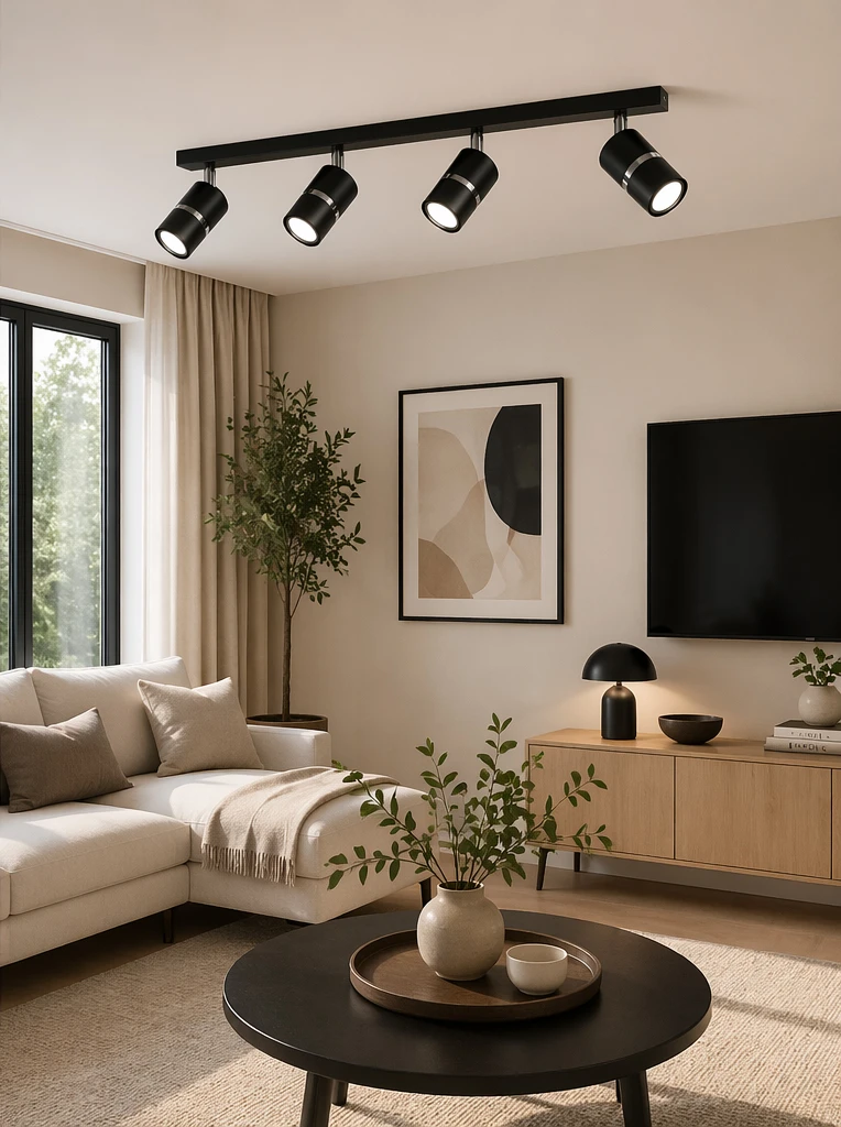 Każdy reflektor można niezależnie ustawić, co daje ogromne możliwości aranżacyjne. Lampa świetnie sprawdzi się jako oświetlenie główne, punktowe lub akcentowe, podkreślając wybrane elementy wnętrza i tworząc odpowiedni klimat.