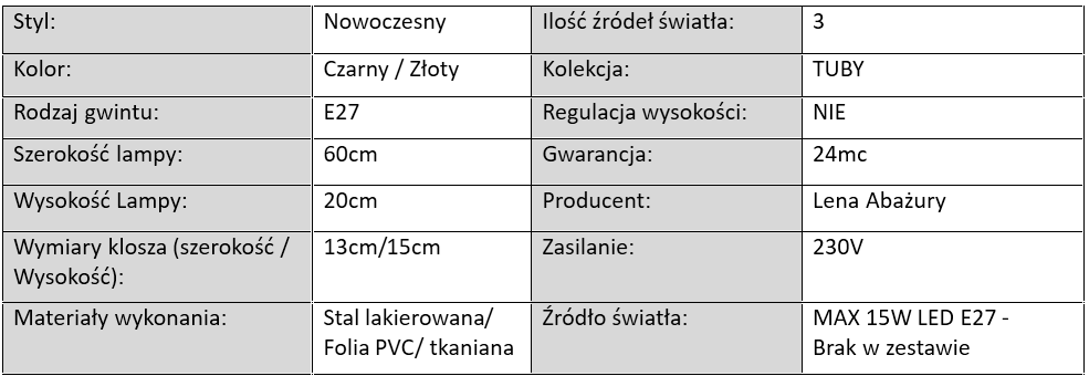 Dzięki swojemu designowi, lampy Tuby łączą prostotę z elegancją. Minimalistyczna forma tuby przełamana została złotym detalem, co sprawia, że oświetlenie nabiera dekoracyjnego charakteru. Dodatkowo zastosowanie popularnych trzonków E27 sprawia, że żarówki są łatwo dostępne i wymienne, a cała konstrukcja jest zarówno funkcjonalna, jak i estetyczna.