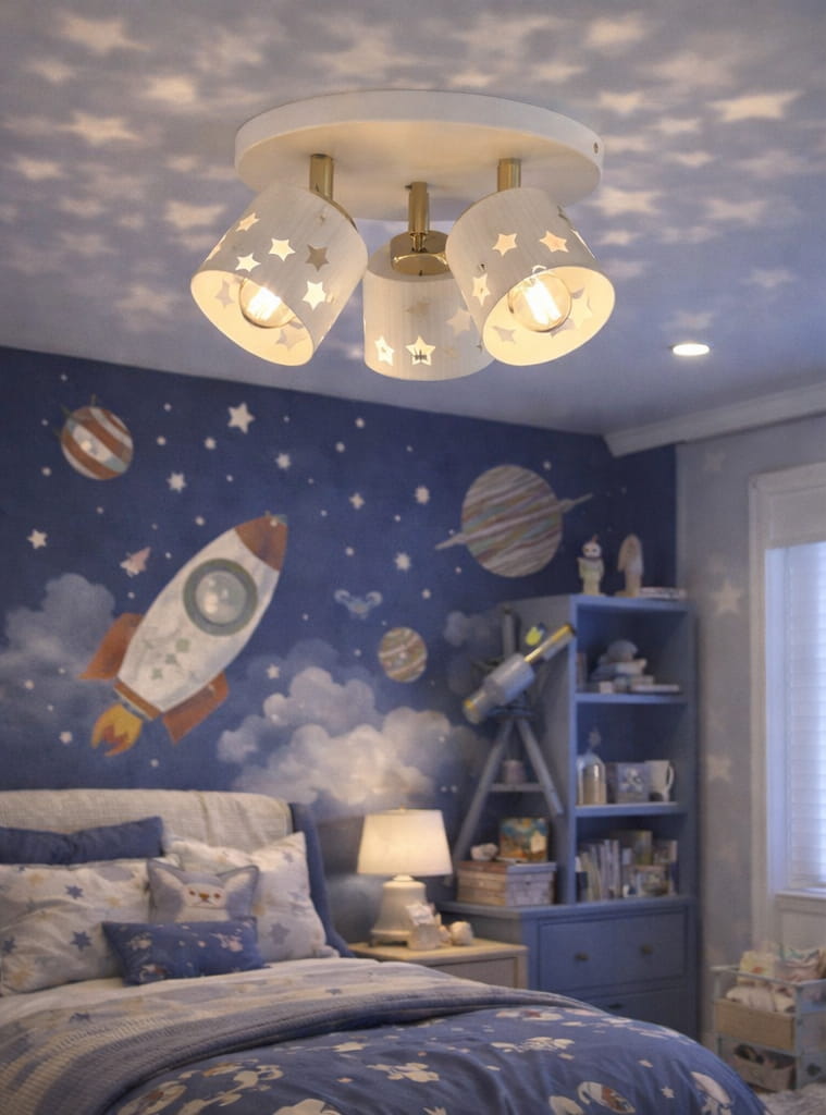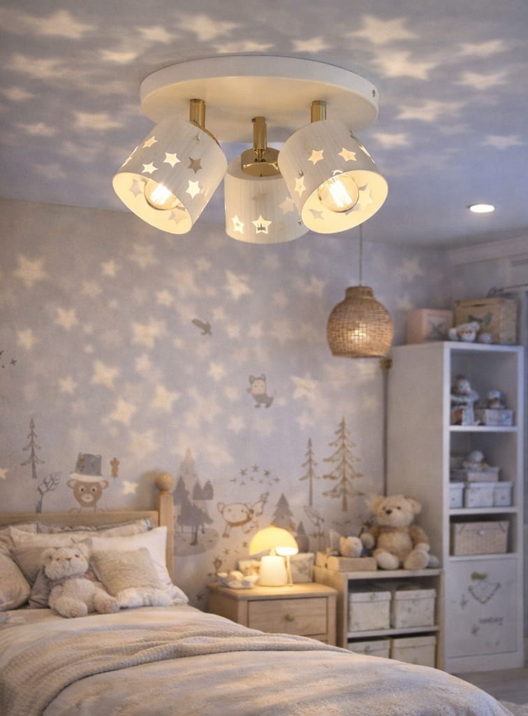 Dekoracyjne wycięcia w kształcie gwiazd subtelnie rozpraszają światło, tworząc miękki efekt na ścianach i suficie. Lampa łączy funkcjonalność z dziecięcą estetyką, pełniąc rolę zarówno praktycznego oświetlenia, jak i stylowej dekoracji wnętrza.